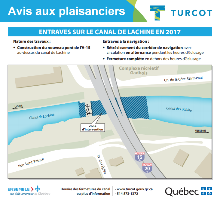 Les plaisanciers devront faire face à des entraves mineures sur le canal de Lachine jusqu’à la fin de la saison de navigation en raison de la reconstruction du pont de l’autoroute 15, près du centre Gadbois, dans le cadre des travaux de l’échangeur Turcot.