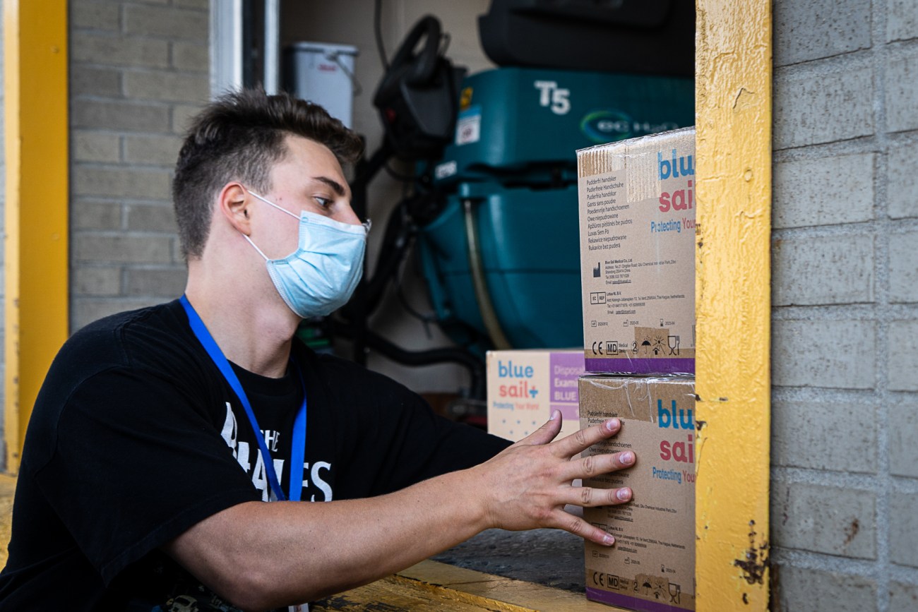 À l’intérieur, les employés fourmillent. Dans les vastes allées, ils rangent et empilent les nombreuses boîtes de cartons remplies de masques de procédure, de gants, de blouses et de bouteilles de désinfectant.
