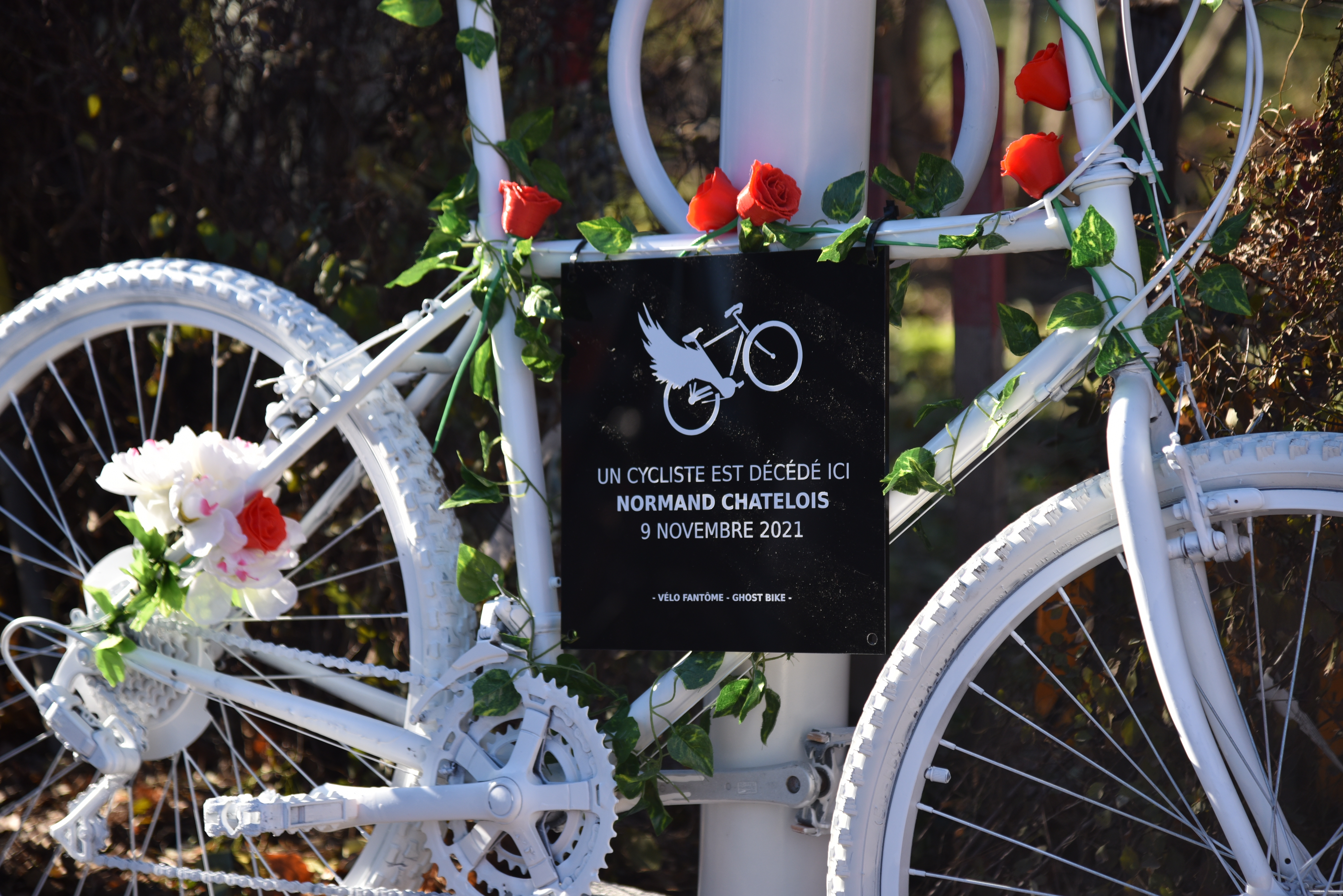 Un vélo blanc et une plaque commémorative ont été installés à la mémoire de Normand Chatelois dimanche, à l’endroit où le cycliste a subi un accident de la route mortel le 9 novembre dernier en début d’après-midi.
