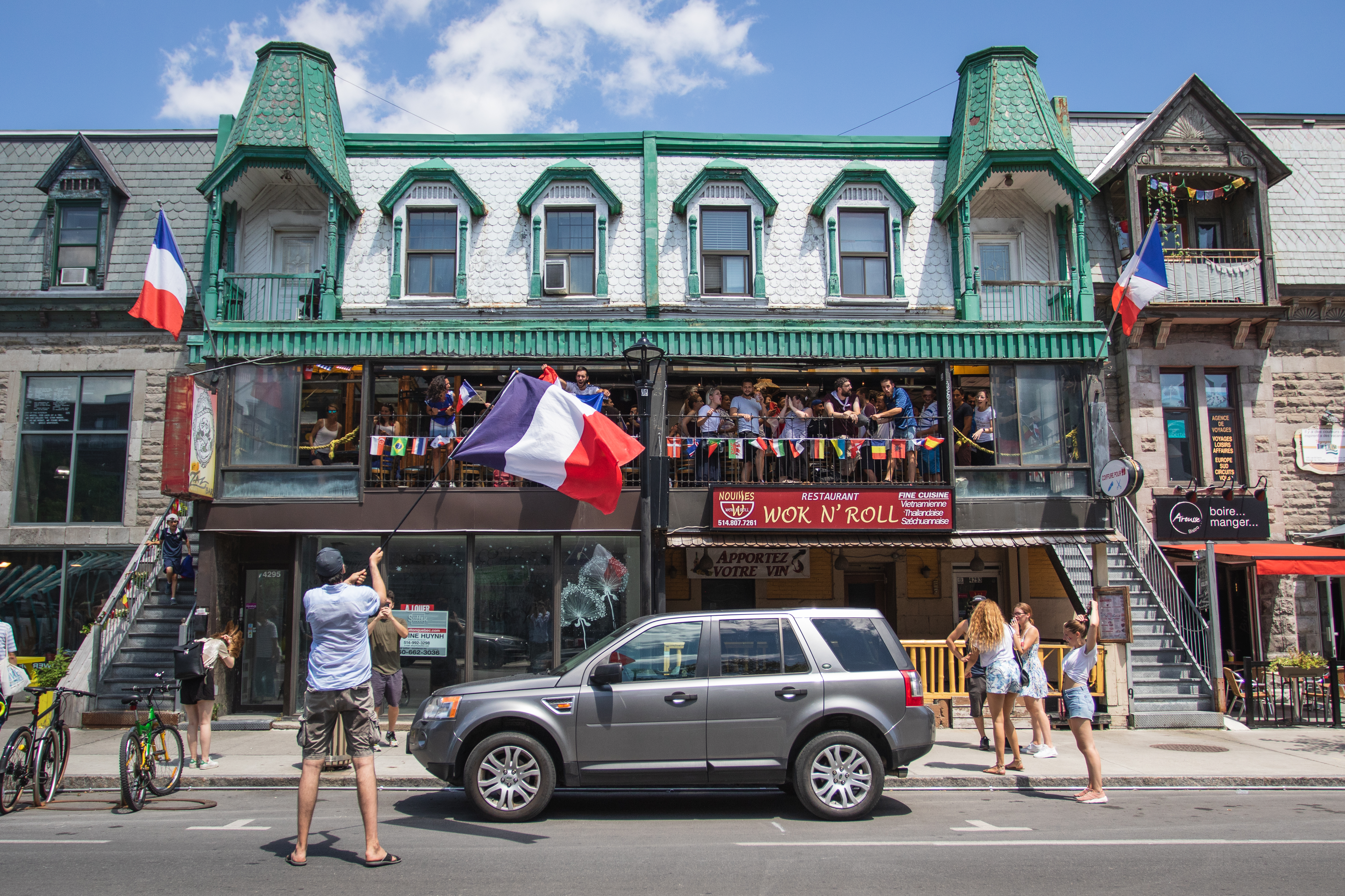 Des fumigènes colorent l’atmosphère en bleu, blanc et rouge, alors que le soleil cogne de toutes ses forces sur une foule rassemblée par ce sacre mondial, après un match haletant contre la Croatie (4-2). «On est les champions, on est les champions, on est, on est, on est les champions!» chantent en chœur les milliers de Français à l’angle des rues Rachel et Saint-Denis, pendant que plusieurs font exploser des bouteilles de champagne ou de bières. Tous l’ont, l’ivresse de la victoire, en entonnant une Marseillaise qu’ils répéteront inlassablement au cours de cette chaude après-midi de juillet.