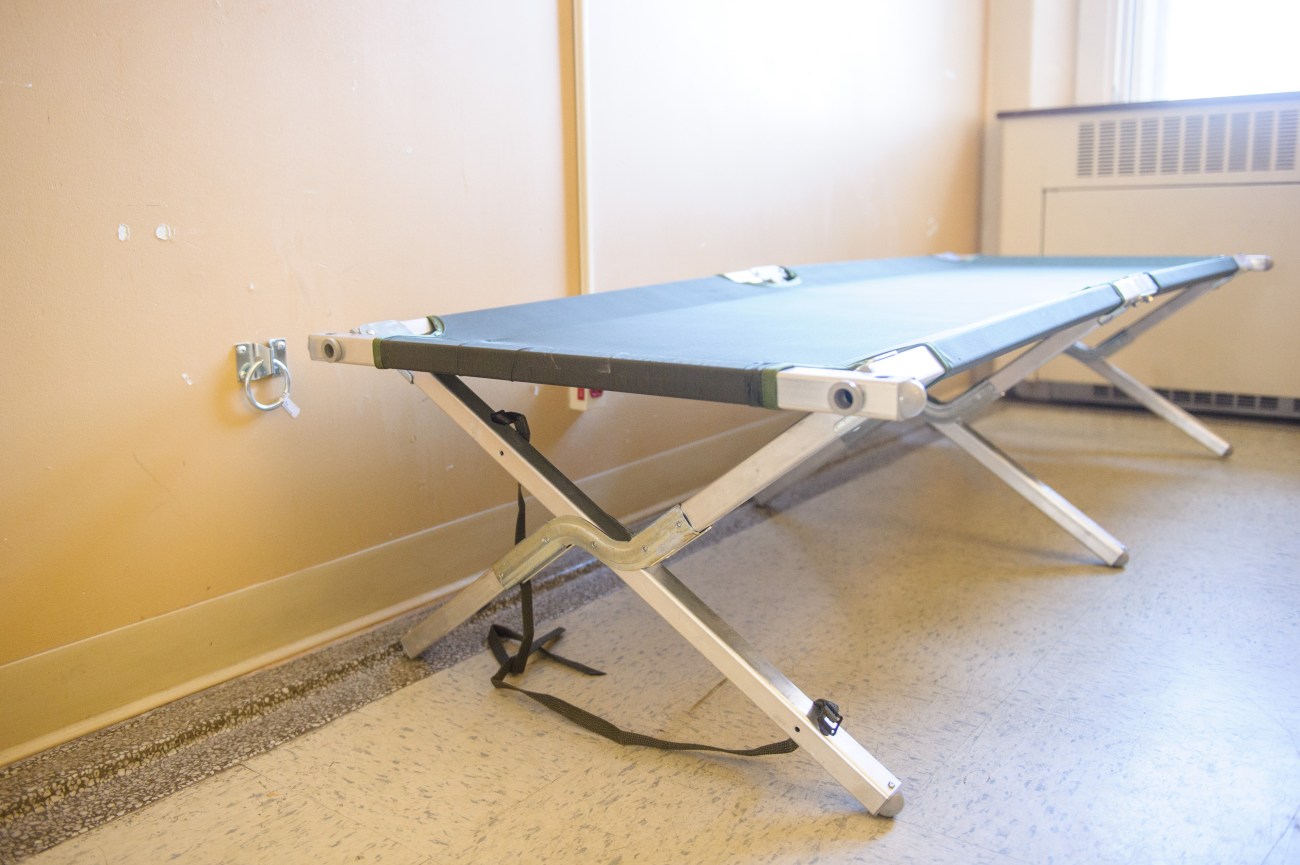 Jusqu’au 15 avril, 80 lits disposés dans les chambres du pavillon Ross, au troisième étage de l’ancien hôpital de Ville-Marie, seront disponibles chaque nuit pour les sans-abris de la métropole. Chacune de ces chambres est munie d’anneaux afin de permettre aux propriétaires d’un animal de compagnie d’attacher celui-ci à côté de leur lit.