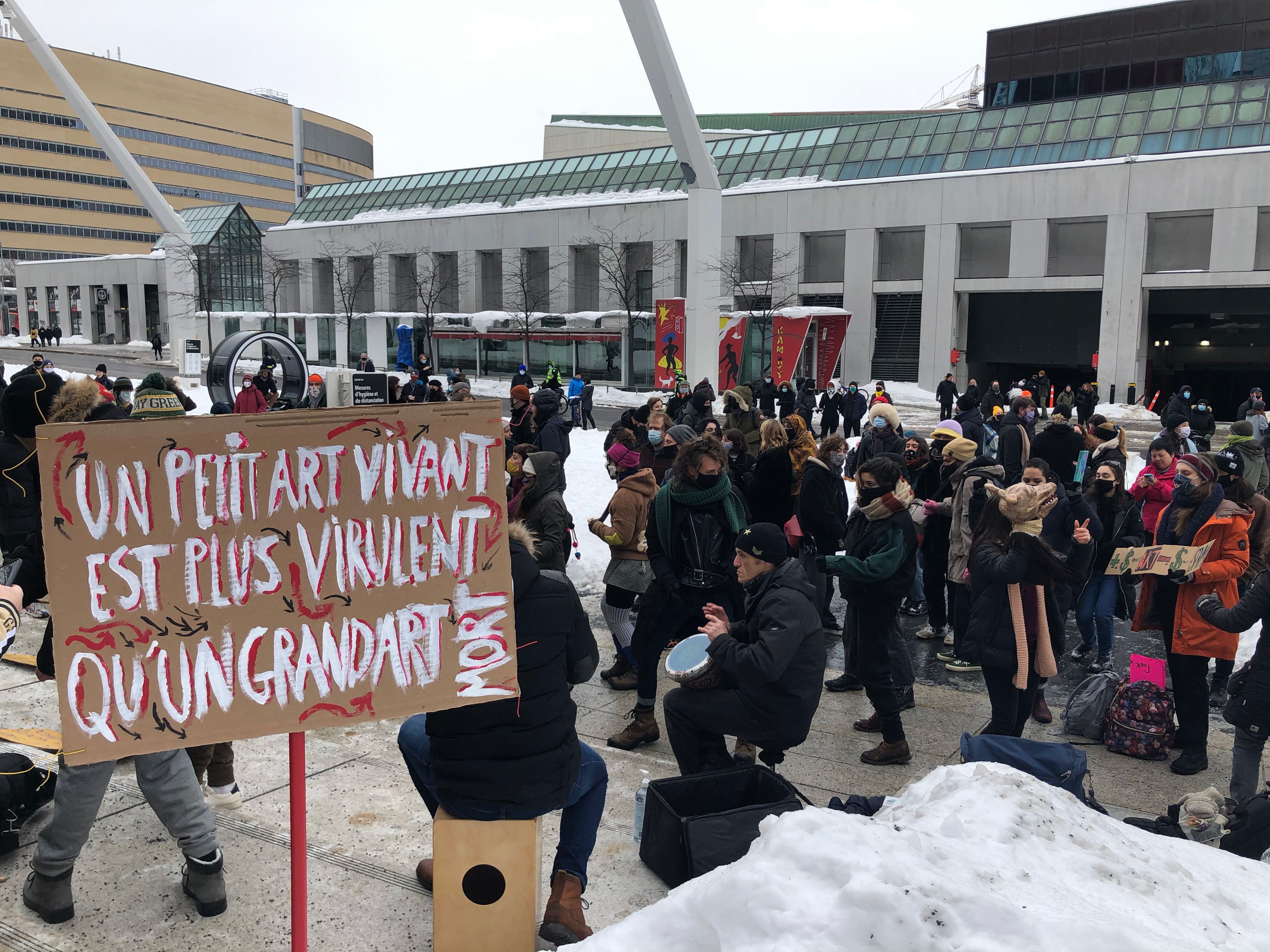 Plus d’une centaine de personnes se sont rassemblées dimanche pour manifester le droit d’accès aux arts vivants, un secteur culturel particulièrement affecté par la pandémie.