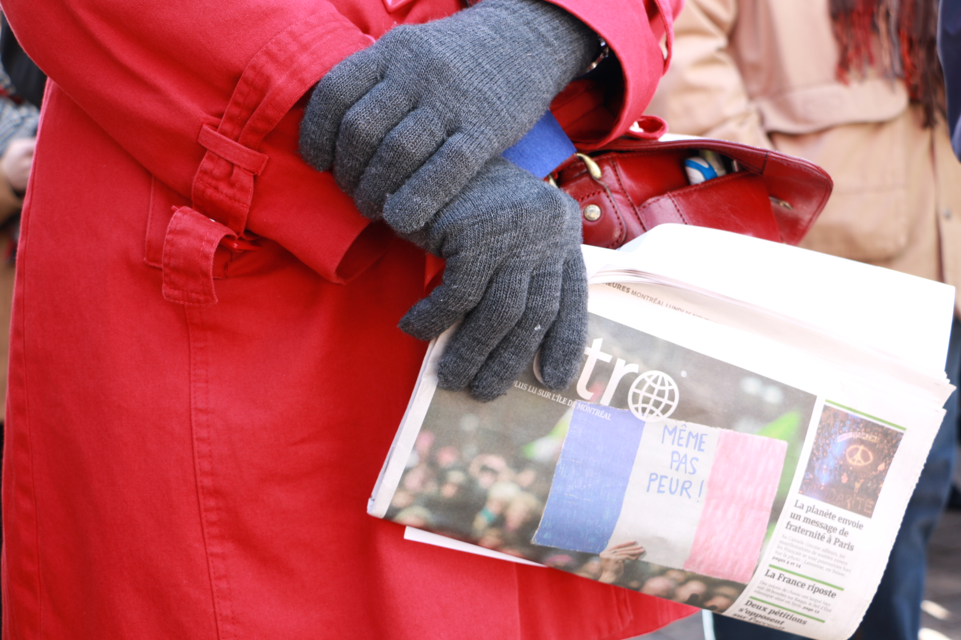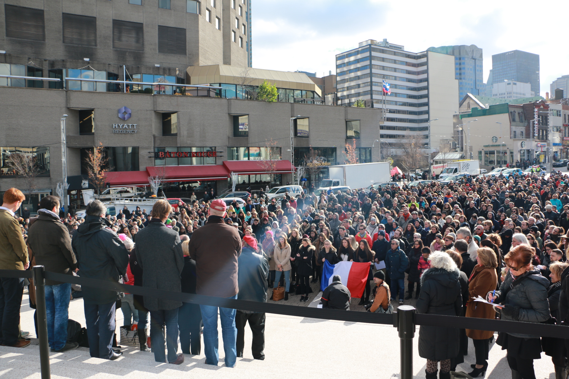 Trois jours après la vague d’attentats qu’a connu Paris, l’Esplanade de la Place des Arts a accueilli lundi midi des centaines de Montréalais venus observer une minute de silence en hommage aux victimes. Le rassemblement qui s’inscrit dans un mouvement de solidarité et de paix a également eu une pensée pour les victimes des attaques terroristes de jeudi à Beyrouth, au Liban. Le maire Denis Coderre ainsi que des personnalités politiques et des artistes ont tour à tour pris la parole afin d’exprimer leur soutien à la France.