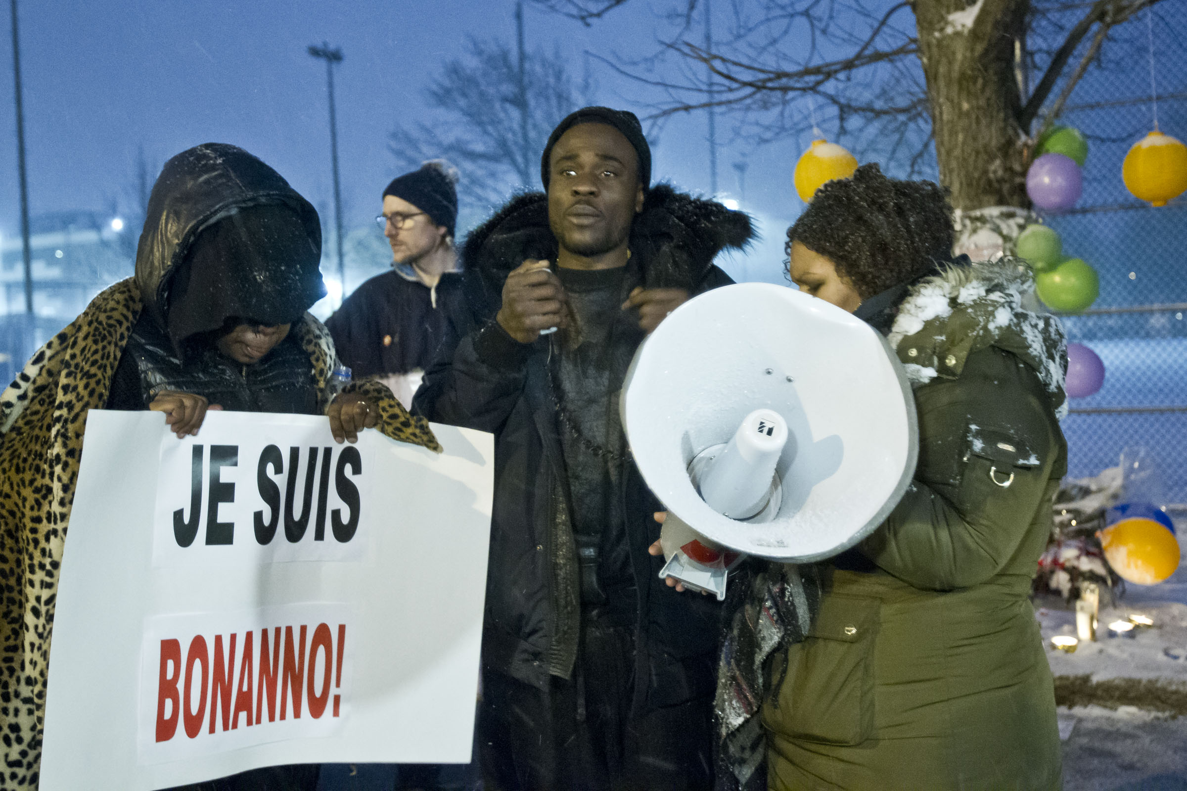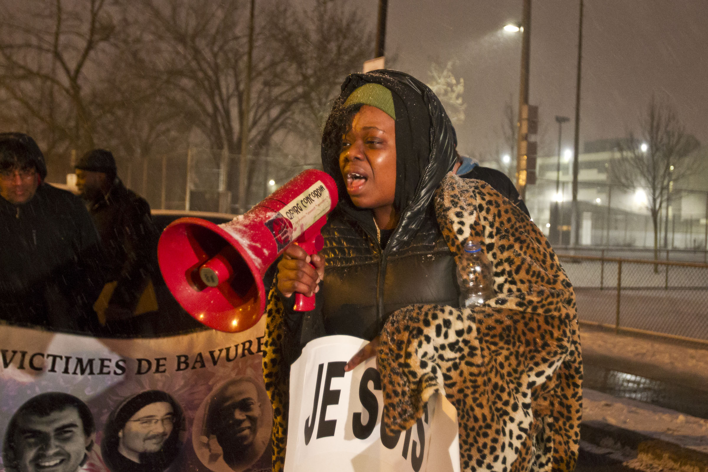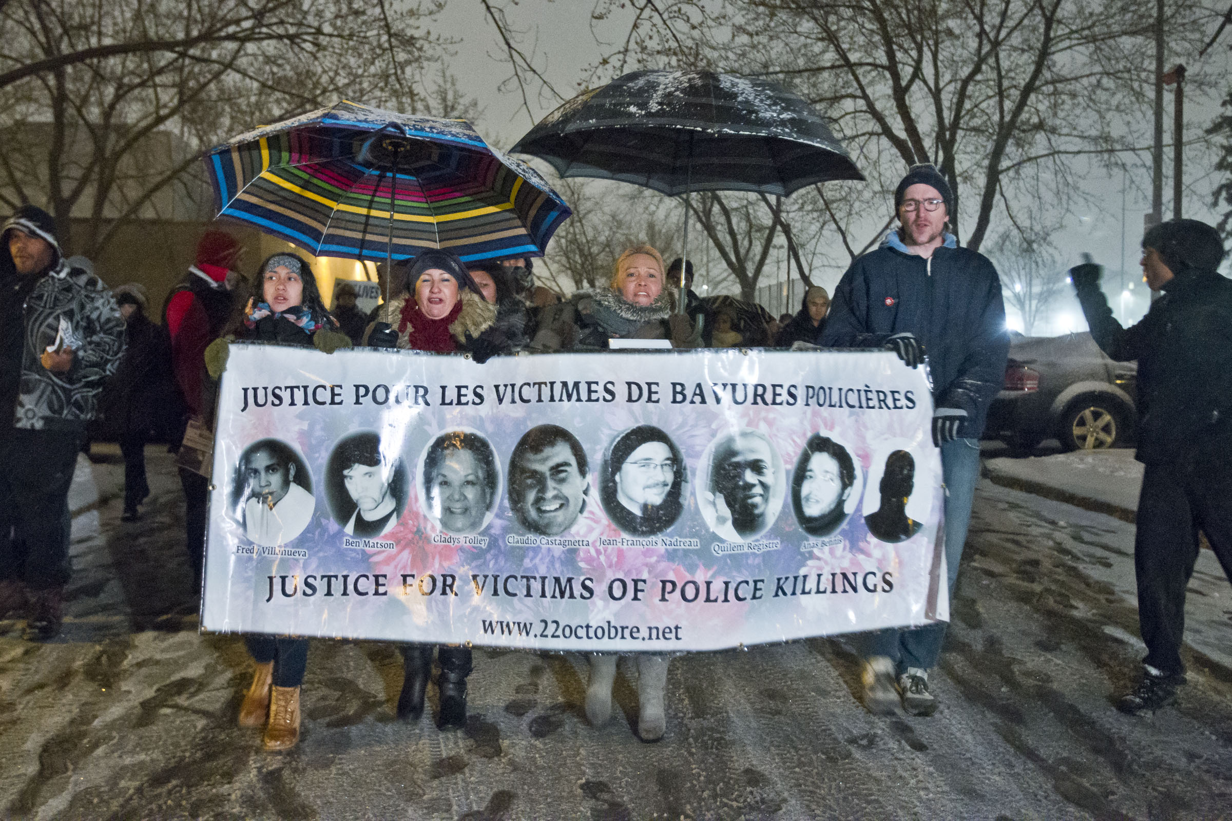 Alors que Lilian Madrid Villanueva, la mère de Fredy, abattu par un policier le 9 août 2008, était en tête du cortège, le portrait de son fils entre les mains, de nombreux résidents de Montréal-Nord et représentants d’organismes tenaient à protester contre les circonstances de cette mort, malgré des conditions climatiques difficiles et les chutes de neige.