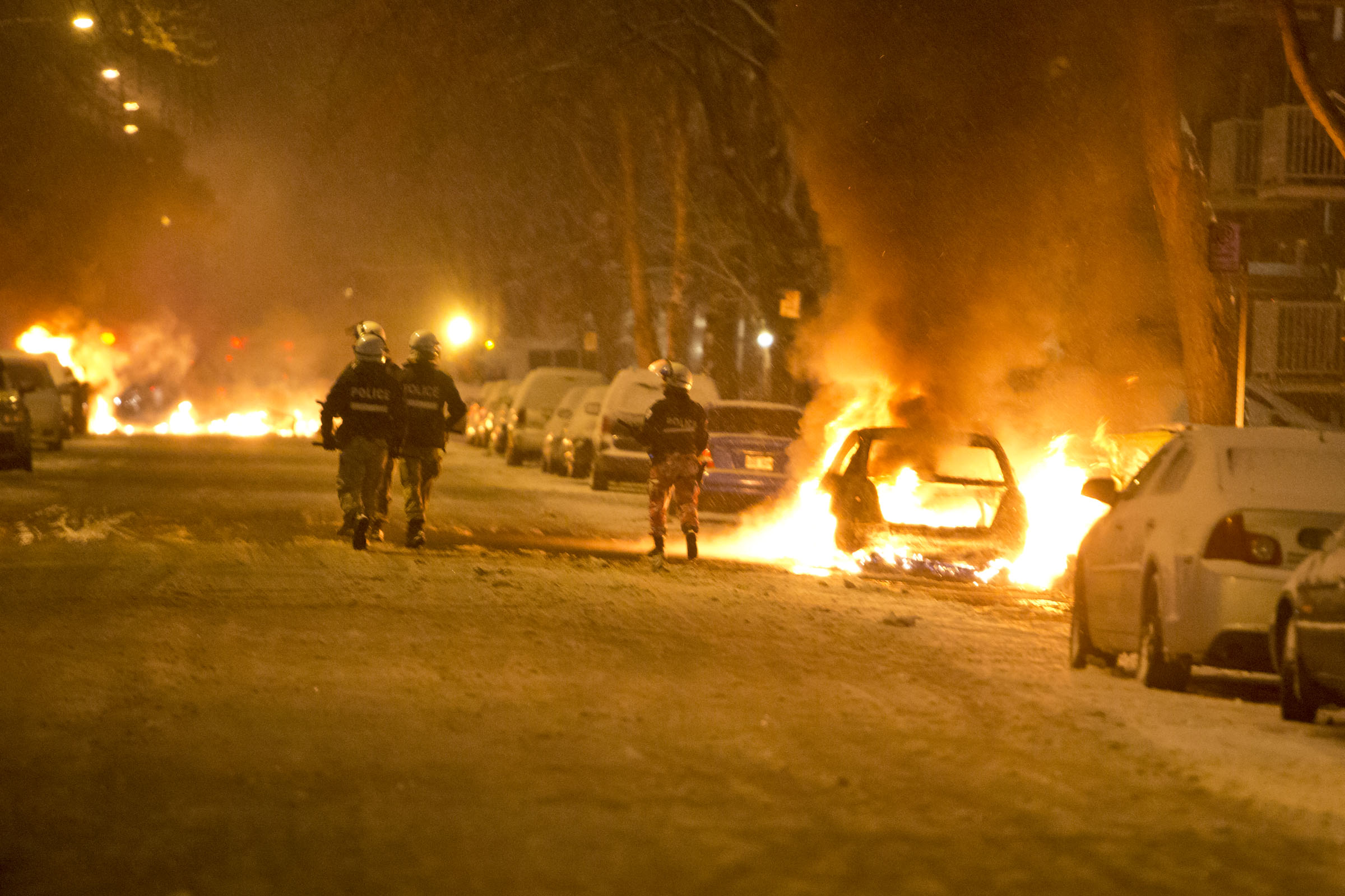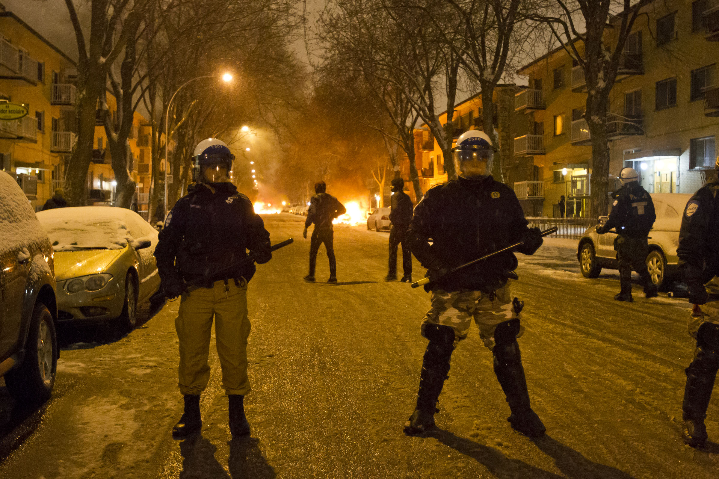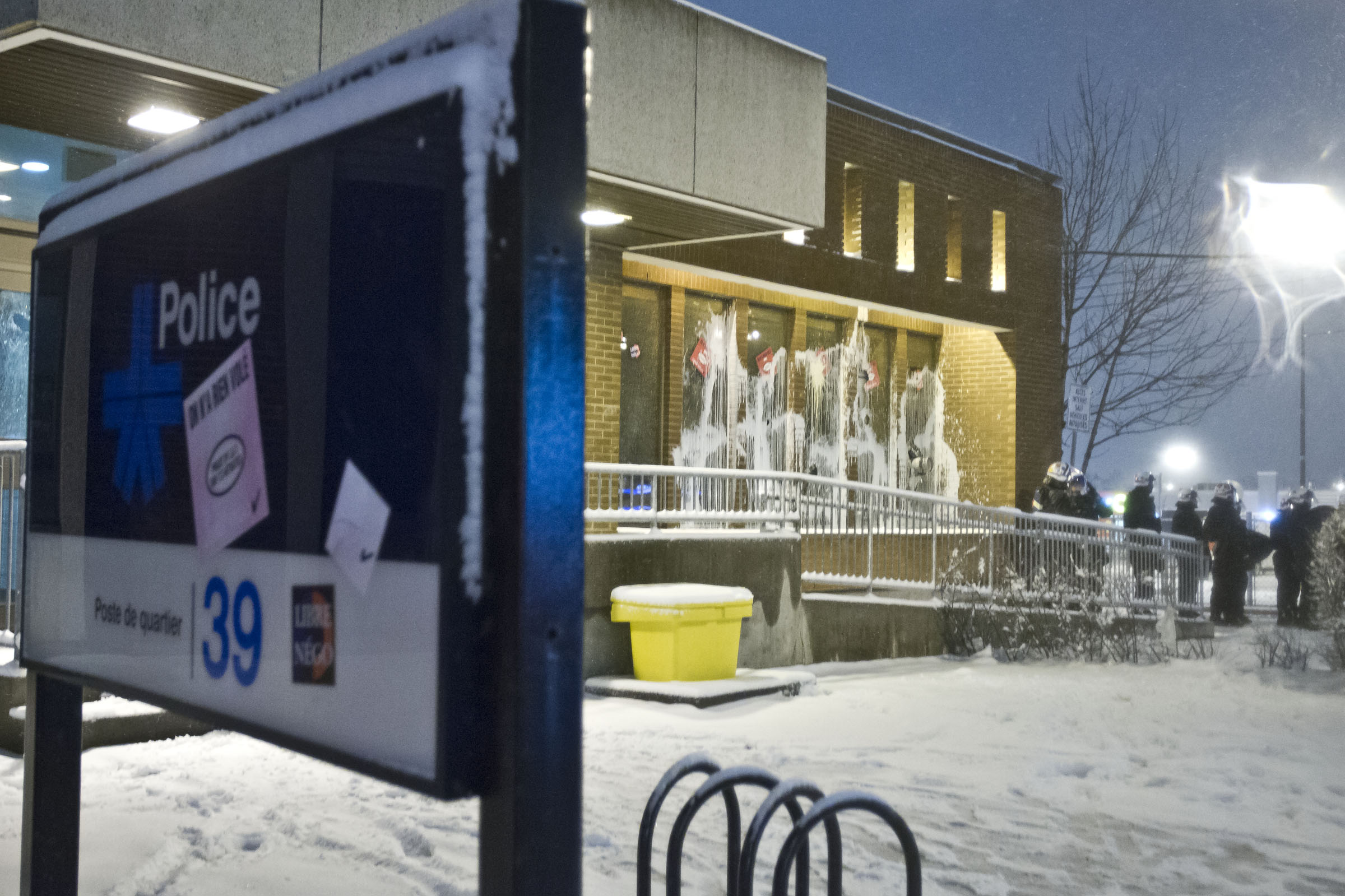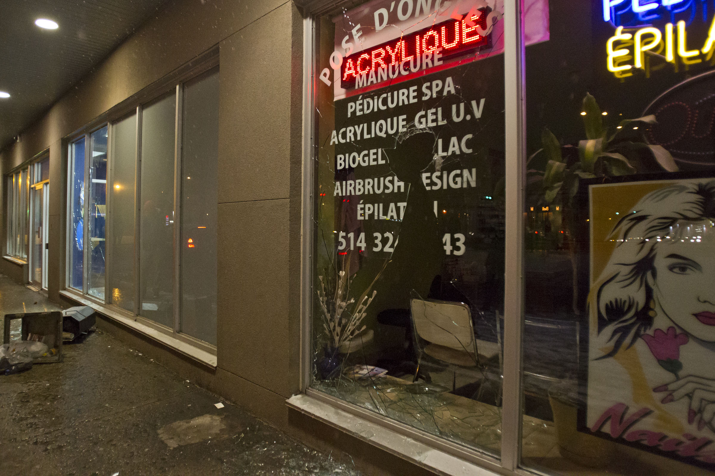 Peu après 21h30, une cinquantaine d’individus se sont rendus devant le poste de quartier 39, sur le boulevard Henri-Bourassa. Des pierres et des pétards ont été lancées avant que les forces de l’ordre ne s’interposent devant les locaux. Les émeutiers ont ensuite traversé la rue et, à l’aide notamment de poubelles sur roulette, ont brisé les vitrines de plusieurs commerces, notamment celles de la Banque de Montréal située à l’intersection de l’avenue Désy.