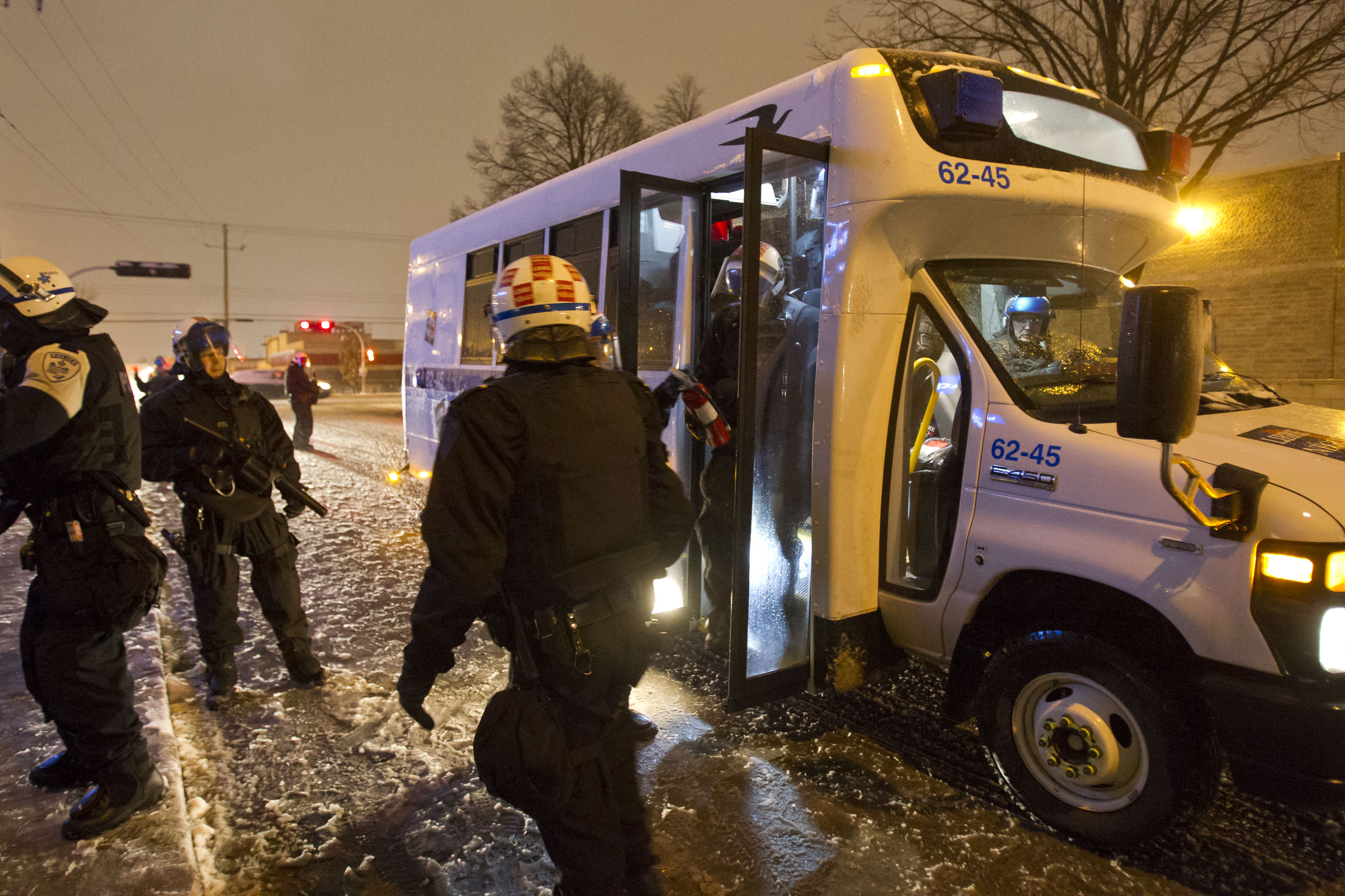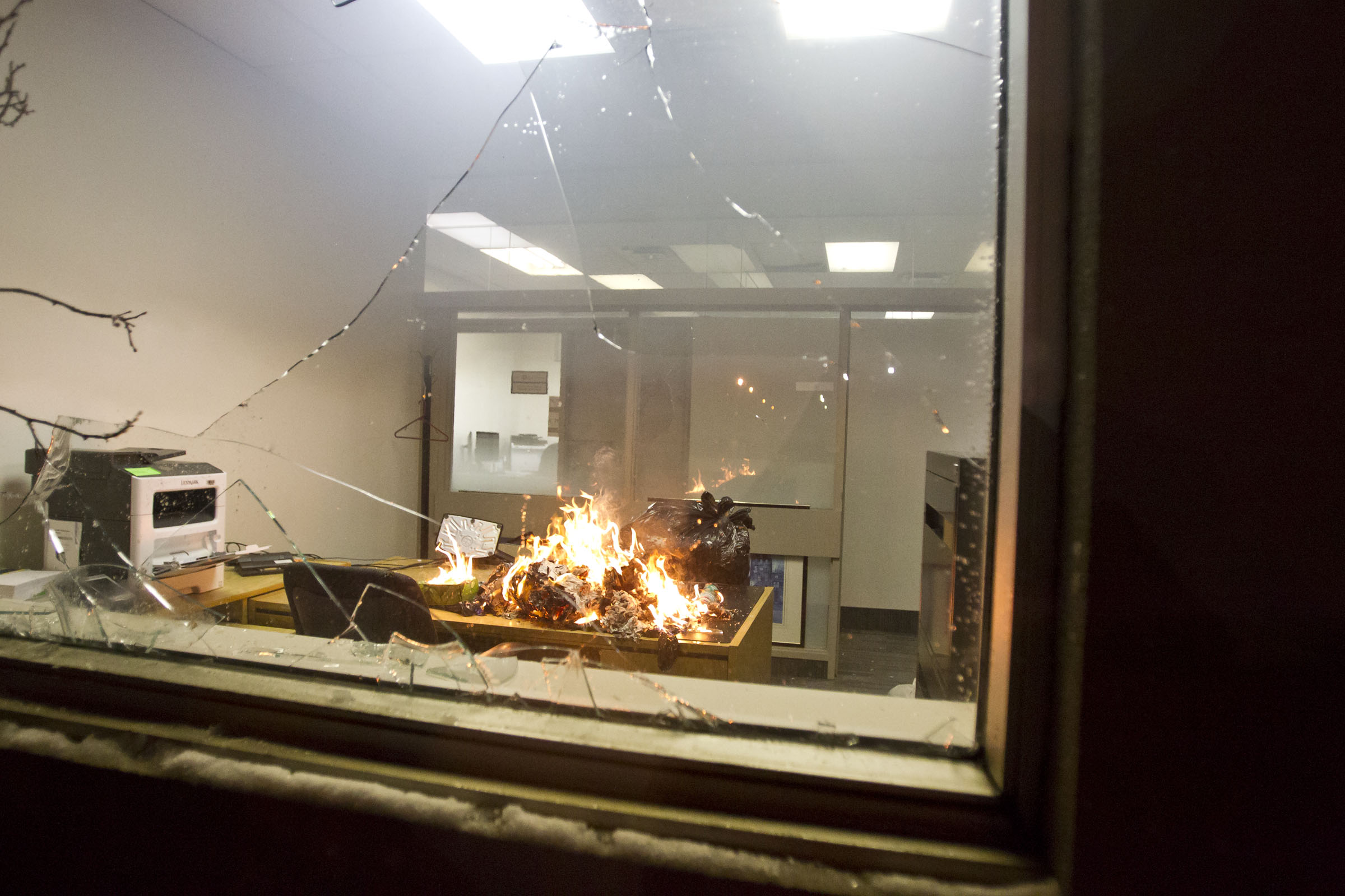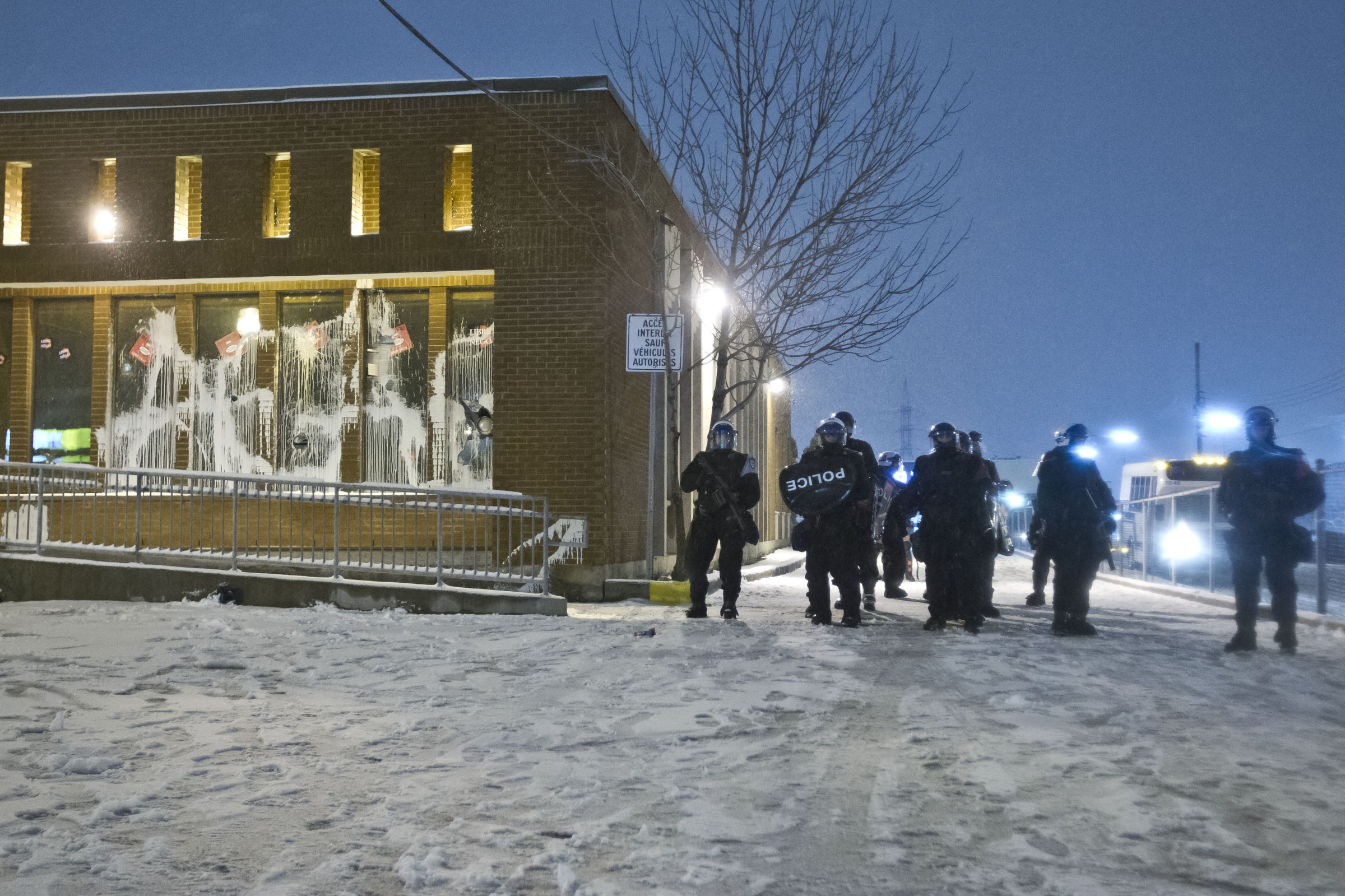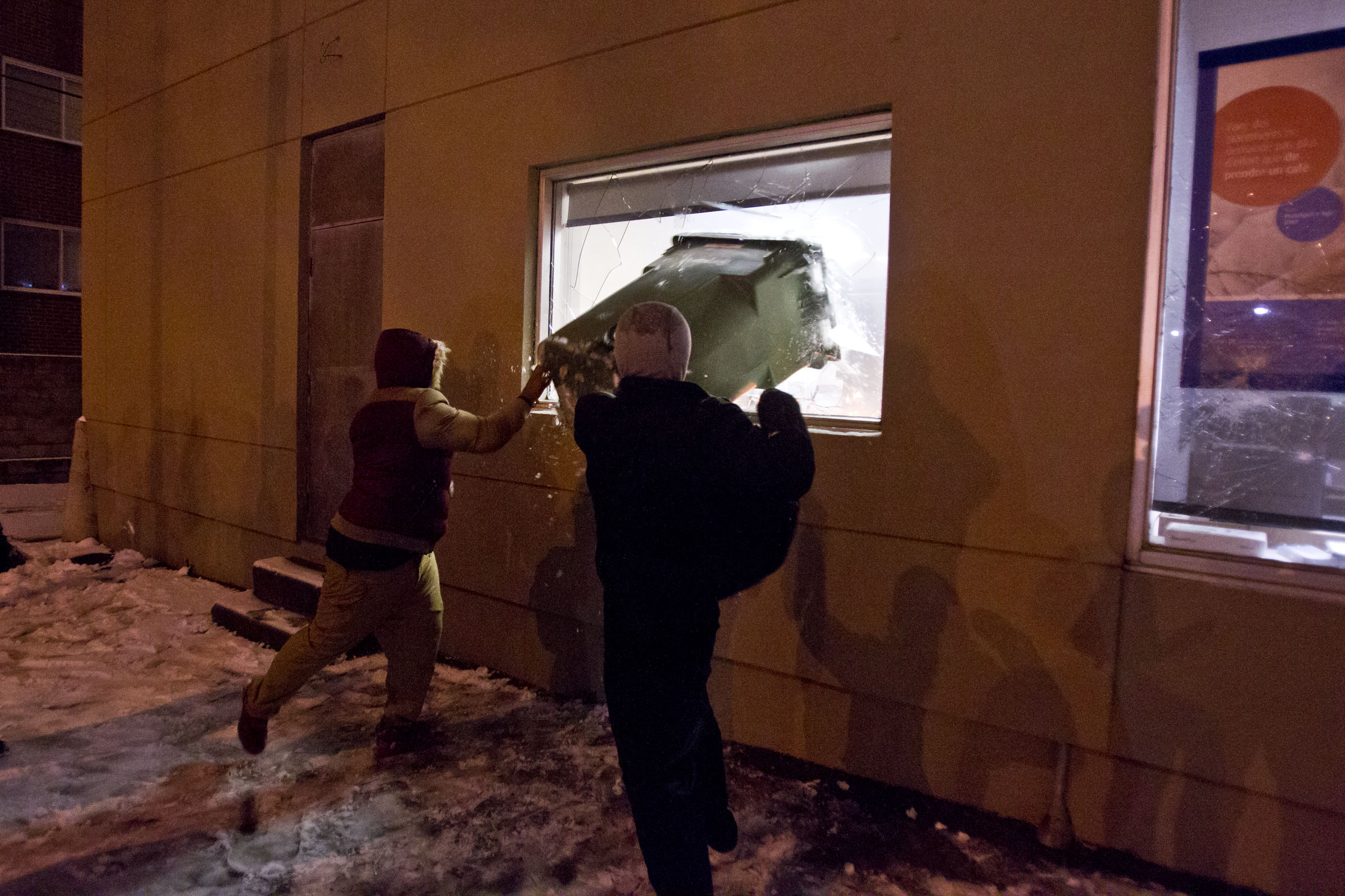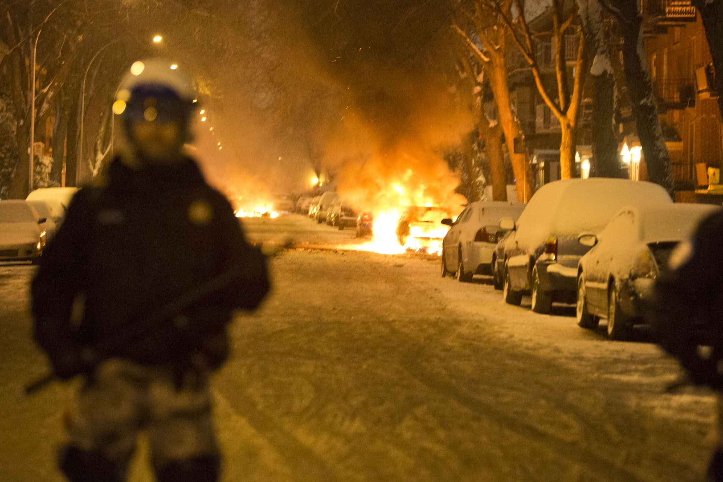 Peu après 21h30, une cinquantaine d’individus se sont rendus devant le poste de quartier 39, sur le boulevard Henri-Bourassa. Des pierres et des pétards ont été lancées avant que les forces de l’ordre ne s’interposent devant les locaux. Les émeutiers ont ensuite traversé la rue et, à l’aide notamment de poubelles sur roulette, ont brisé les vitrines de plusieurs commerces, notamment celles de la Banque de Montréal située à l’intersection de l’avenue Désy.