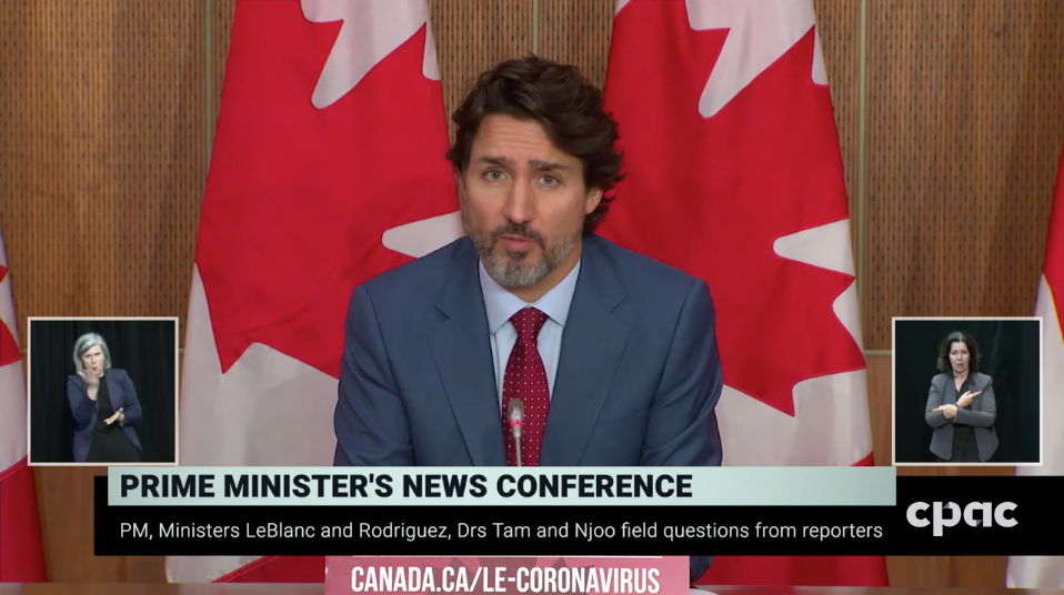 Le premier ministre Justin Trudeau était accompagné du ministre des Affaires intergouvernementales Dominic LeBlanc ainsi que de la Dre Theresa Tam, administratrice en chef de la santé publique et de son adjoint le Dr Howard Njoo pour faire le point sur les mesures prises par le gouvernement fédéral sur la lutte contre la pandémie de COVID-19.