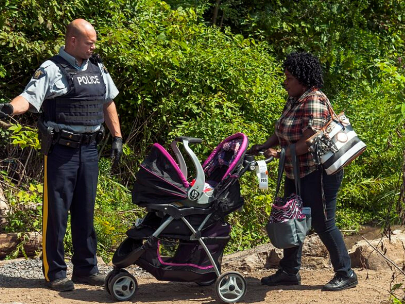 Mais une fois à ce point de passage irrégulier de la longue frontière entre les deux pays, comment cela se passe pour quelqu’un qui cherche la protection et une vie meilleure? Une fois interceptée par un policier de la Gendarmerie royale du Canada (GRC), la personne se voit remettre trois formulaires (un générique sur son identité, un sur ses antécédents judiciaires et un dernier sur son parcours migratoire).