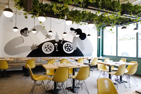 C.G.: J’ai toujours aimé dessiner ce qui se passe autour de moi. Je me souviens que je griffonnais déjà sur les murs de l’appartement dans lequel je suis née! Ça fait bien rire ma mère, maintenant que je peins des murales… Quand j’étais enfant, mes parents nous emmenaient souvent manger dans un restaurant grec de la rue Saint-Denis, chez Tasso [l’établissement a fermé depuis], et le chef nous donnait des crayons de cire et des napperons en papier pour nous occuper ma sœur et moi. Il racontait toutes sortes d’histoires sur sa vie en Grèce et je m’amusais à dessiner les villages, la mer et les pêcheurs de ses récits. À mes 18 ans, M. Tasso m’a offert une grosse enveloppe dans laquelle il avait conservé tous les dessins que j’avais griffonnés sur ses napperons. C’était un cadeau très symbolique!