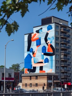 C.G.: C’est un projet qui souligne le 50e anniversaire de l’Office municipal d’habitation de Montréal. J’ai dessiné des personnages qui jouent avec des maisons sur le mur d’un immeuble résidentiel pour illustrer le sentiment communautaire. La réalisation a pris 14 jours, une grue et environ 50 gallons de peinture! Ce n’était pas facile; je ne pensais pas avoir le vertige, mais maintenant, je peux vous assurer que oui. (Rires)