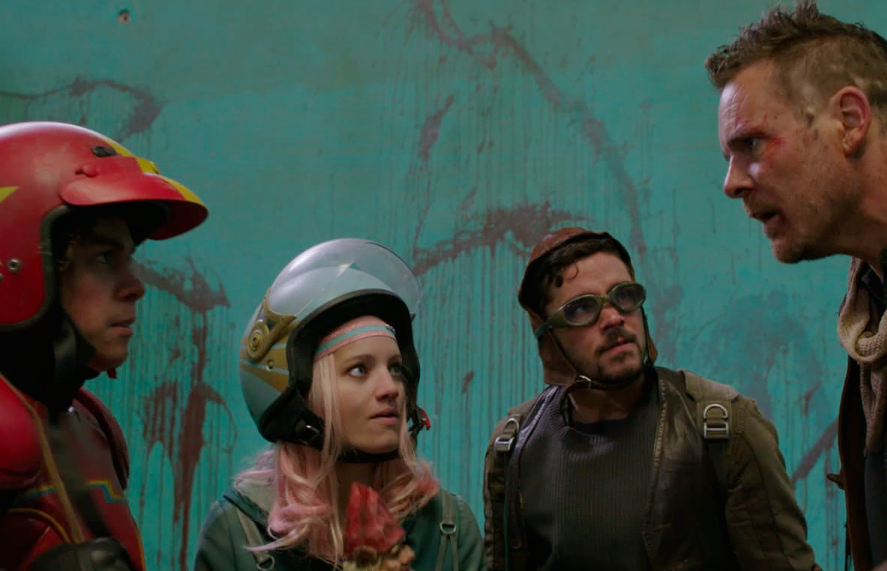 Turbo Kid, premier long métrage de Yoann-Karl Whissell, Anouk Whissell et François Simard (aussi connus sous le nom de leur collectif, Roadkill Superstar – RKSS), raconte l’histoire du Kid (Munro Chambers), un orphelin qui fait du troc contre de l’eau potable, une ressource devenue rarissime. Il rencontre Apple (Laurence Lebœuf), une fille aux cheveux roses plutôt toquée, sorte de concentré de naïveté et de pureté, qui s’incruste dans sa vie malgré lui. Mais Apple se fait kidnapper par le méchant Zeus (Michael Ironside), ce qui bouleverse la vie du Kid.