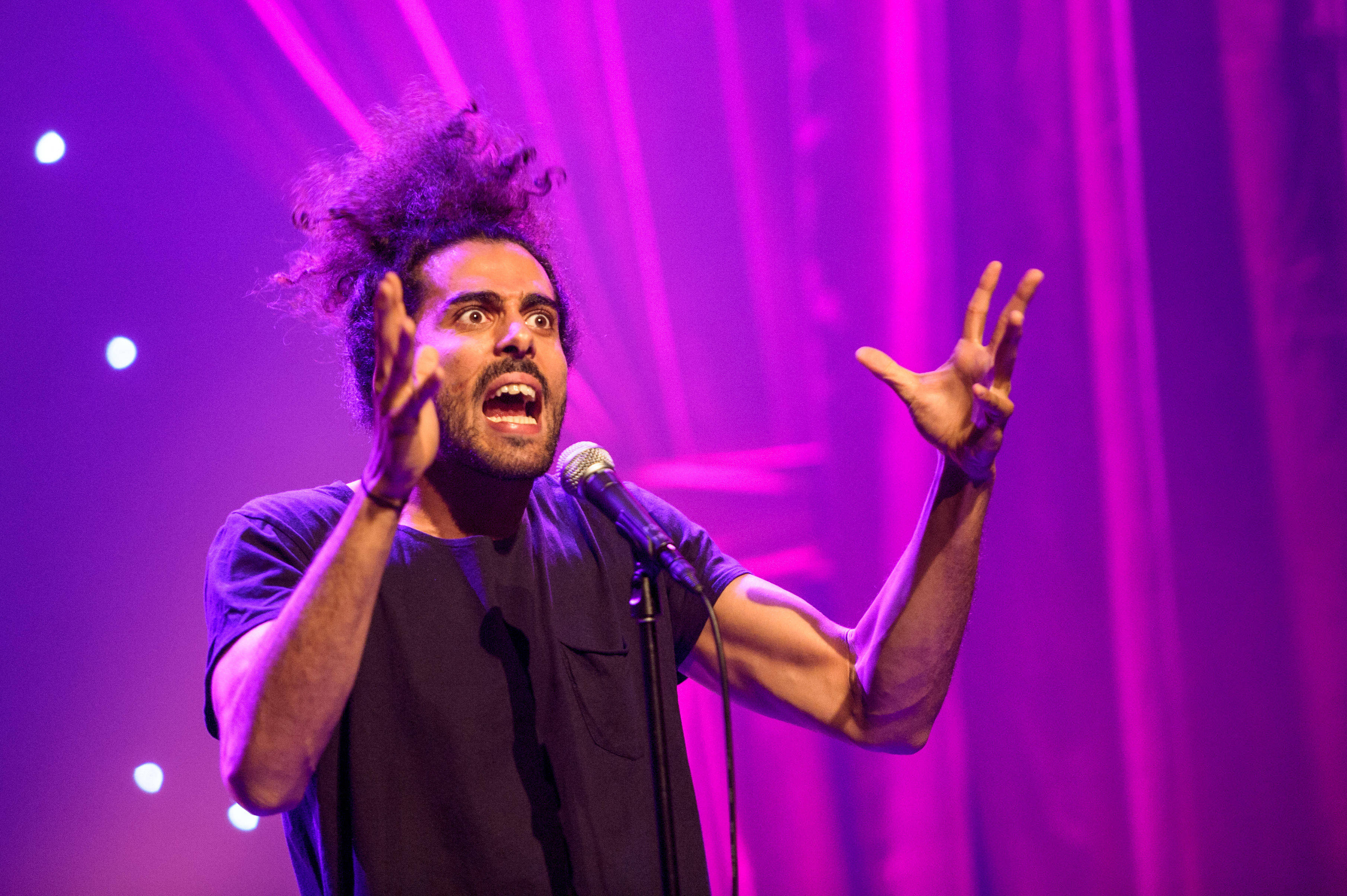 Sans tambour ni trompette, Adib Alkhalidey présentait mercredi soir son deuxième one-man show, Ingénu, dans une 5e salle de la Place des arts bondée. Vous n’en aviez pas entendu parler? C’est normal. Si son premier spectacle, Je t’aime, avait connu un bon succès, et que depuis, l’humoriste s’est fait connaître du grand public avec la série Like-moi!, sa websérie 7$ par jour et ses apparitions dans Les beaux malaises, il a choisi la voie du bouche à oreille plutôt que de faire de la promotion pour ce nouveau spectacle, dont la première montréalaise a eu lieu dans le cadre du festival Juste pour rire.