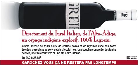 Une nouveauté qui nous provient d’Oregon; un assemblage atypique de quatre cépages : pinot gris, sémillon, müller-thurgau et gewurztraminer. Avec une pointe résiduelle de sucre (6g/l), ce vin demi-sec vous étonnera. Au nez, il dégage d’enjôleurs arômes exotiques. La bouche, quant à elle, révèle plutôt des notes de zeste de citron, de pamplemousse, de pêche blanche et de fines herbes. Avec un côté vif et fringant, il rafraîchit la bouche; ce qui équilibre bien son côté un peu sucré. Idéal lorsque combiné à des plats asiatiques sucrés ou épicés, comme un poulet général tao, un sauté au gingembre ou avec notre recette de tartare au saumon au sucre d’érable. Délicieux!