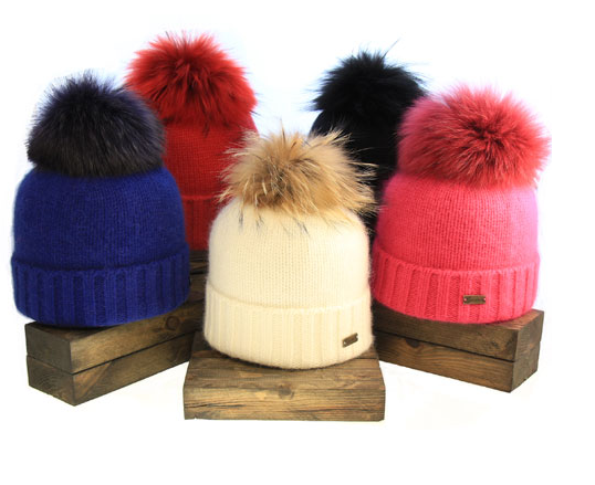 Tuque ornée d’un pompon de fourrure (modèle Lorie), Grenier Boutique, 80$ (www.fourruresgrenier.ca)