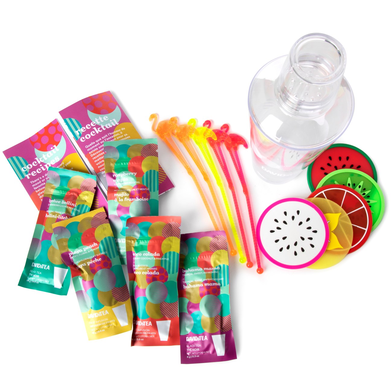 Cet ensemble contient tout ce qu’il faut pour préparer un mocktail au thé au prochain 5 à 7: un mélangeur en plastique, cinq thés cocktail en feuilles (Mojito à la framboise, Coco colada, Playa pêche, Bellini-litchi et Bahama mama), un livret de recettes, cinq bâtonnets flamant rose et cinq sous-verres colorés