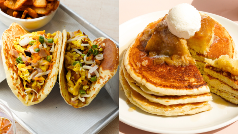 Deux choix de tacos déjeuners sont aussi proposés: «L’Œufrier ouvre à Los Cabos» composé de deux tacos pancakes garnis d’œufs brouillés, oignons, tomates, cheddar, et bacon, servis avec guacamole et patates, et «Miguelito le célèbre», qui consiste en deux tacos pancakes garnis d’œufs brouillés, jambon, bacon et cheddar, servis avec patates et sirop d’érable.