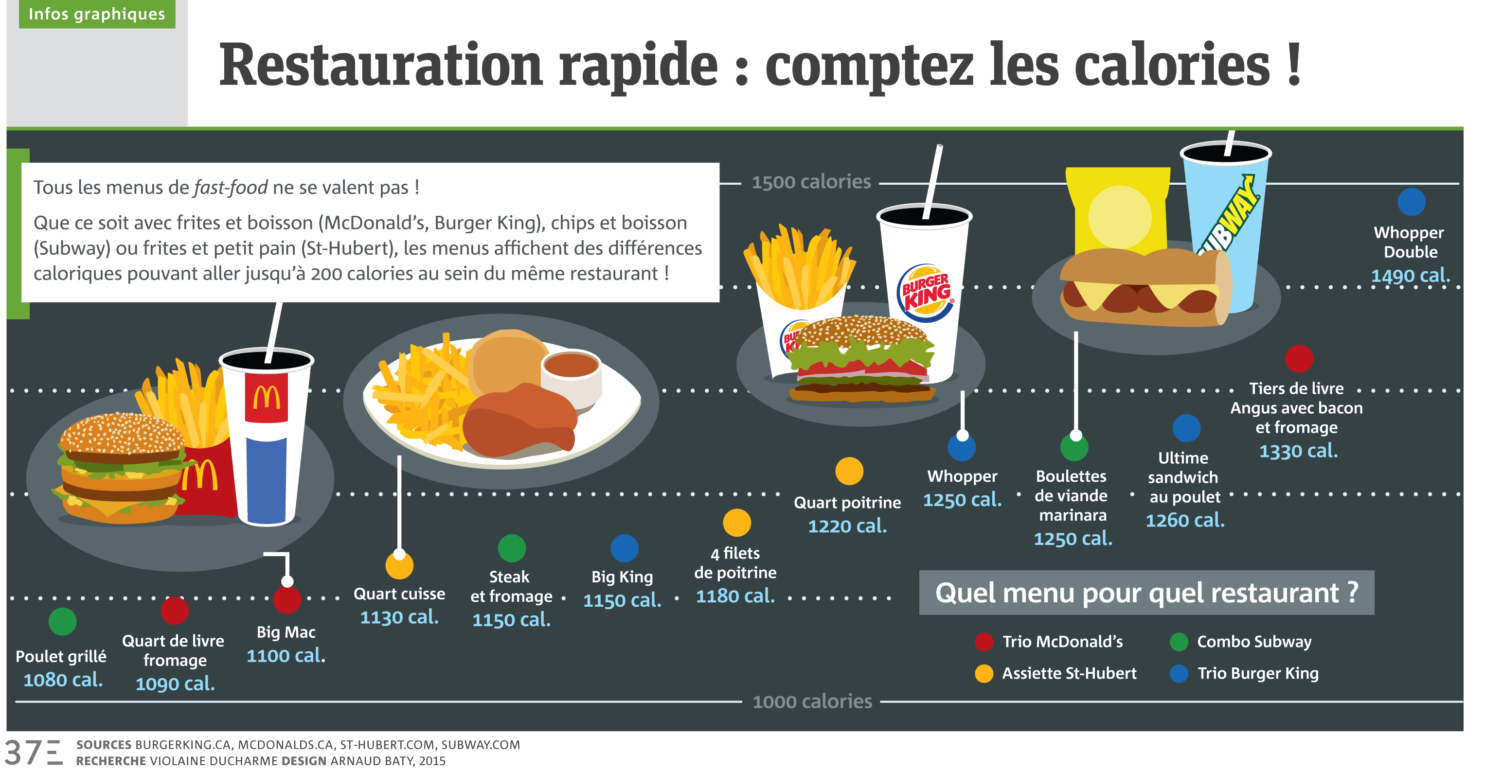 Tous les menus de fast-food ne se valent pas! Que ce soit avec frites et boisson (McDonald’s, Burger King), chips et boisson (Subway) ou frites et petit pain (St-Hubert), les menus affichent des différences caloriques pouvant aller jusqu’à 200 calories au sein du même restaurant!