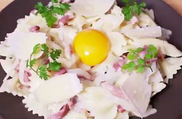 Dans une vidéo, on les voit faire ce qu’ils appellent des pâtes carbonara «dans un seul plat», avec des farfalles (trahison!), de la crème fraîche, des oignons et du bacon (bouilli…). Une vraie recette de pâtes carbonara se fait avec de la pancetta, du parmesan, du fromage Pecorino, de l’huile d’olive, de l’ail et un oeuf cru. Pas de crème fraîche, ni de bacon ou d’oignons.