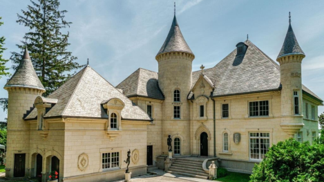 En plus d’arborer des tourelles – dont la plus haute fait 50 pieds – et des toits en tuiles d’ardoise et de cuivre, la demeure est bordée de colonnes de pierre de style antique, d’une vaste terrasse et d’une piscine creusée chauffée.