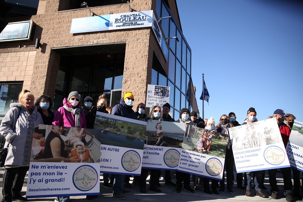 Des manifestants se sont réunis le 29 octobre devant les bureaux de la députée de Pointe-aux-Trembles, Chantal Rouleau. Ils ont dénoncé que Québec souhaite expulser plusieurs résidents de l’île Sainte-Thérèse alors qu’un projet de parc écotouristique est dans les cartons pour ce territoire.