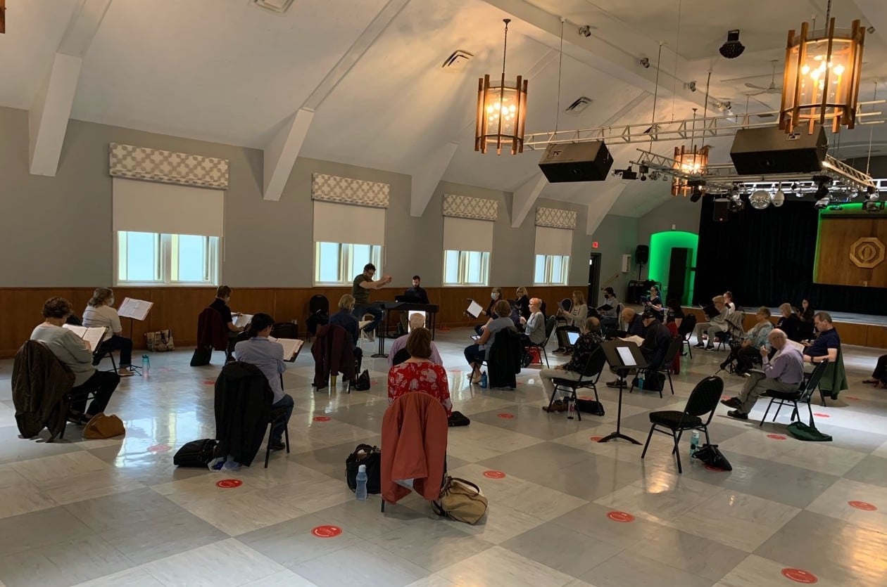Les choristes peuvent maintenant pratiquer dans le sous-sol de l’église Sainte-Trinité à Vaudreuil-Dorion sans masque, mais en maintenant une distanciation physique.