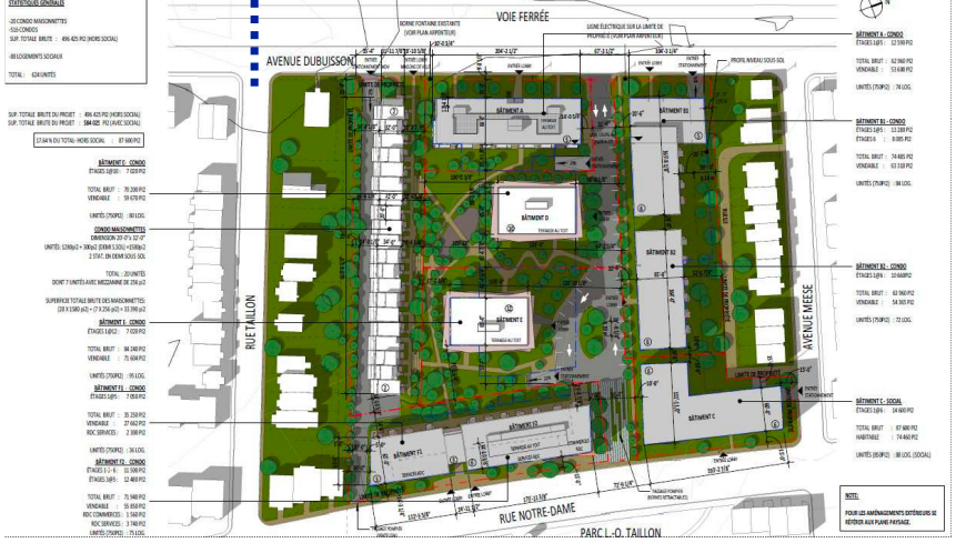 Le projet à l’étude, mené par le Groupe Prével comprend la construction de 519 unités de logements privés, 20 maisons de ville et 88 logements sociaux. C’est donc un total de 627 unités d’habitation qui pourraient s’ériger sur le terrain d’une superficie équivalente à près de cinq terrains de football, situé au 9205 rue Notre-Dame Est. Il est également question d’une partie commerciale, mais le type de commerce n’est toujours pas déterminé.