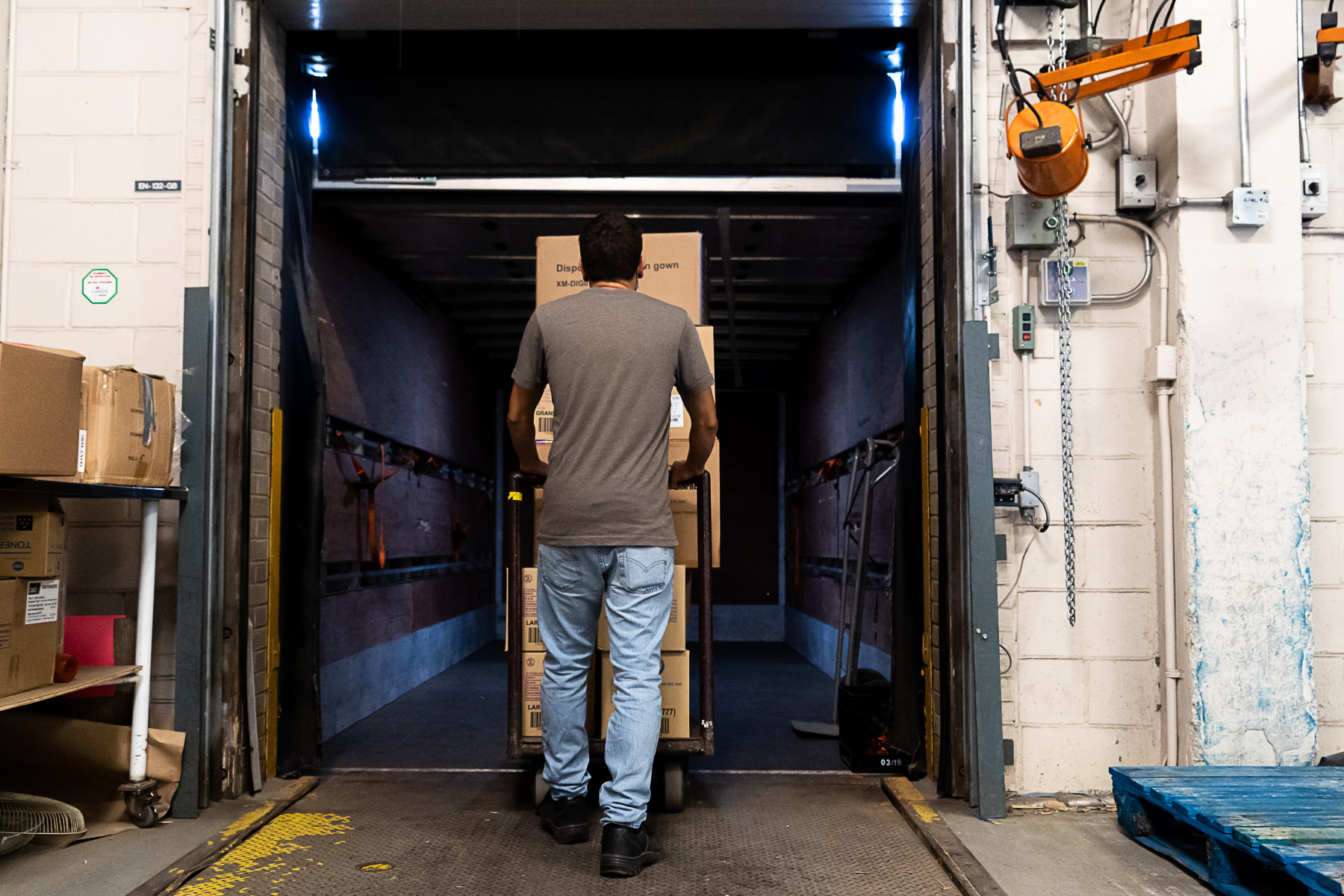 À l’intérieur, les employés fourmillent. Dans les vastes allées, ils rangent et empilent les nombreuses boîtes de cartons remplies de masques de procédure, de gants, de blouses et de bouteilles de désinfectant.