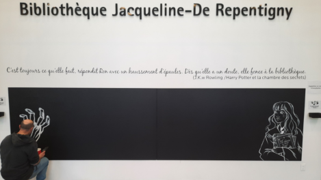 Le hall de la bibliothèque Jacqueline-De Repentigny s’est récemment transformé en espace de création artistique pour les citoyens. Les Verdunois sont invités à dessiner sur les murs d’ardoise avec les craies qui sont mises à leur disposition.