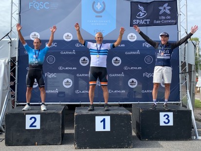 C’est avec une médaille d’or au cou que le Dorvalois Michel Ostiguy est revenu des Championnats québécois sur route élite de Baie-Comeau au début du mois. Le coureur de 56 ans admet avoir eu de la difficulté à s’entraîner pendant le confinement.
