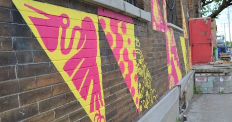 La densité du mural se retrouve principalement près de la rue Notre-Dame, là où l’on retrouve le plus grand nombre de passants. La concentration de formes géométriques s’ajuste au bâtiment lui servant de toile.