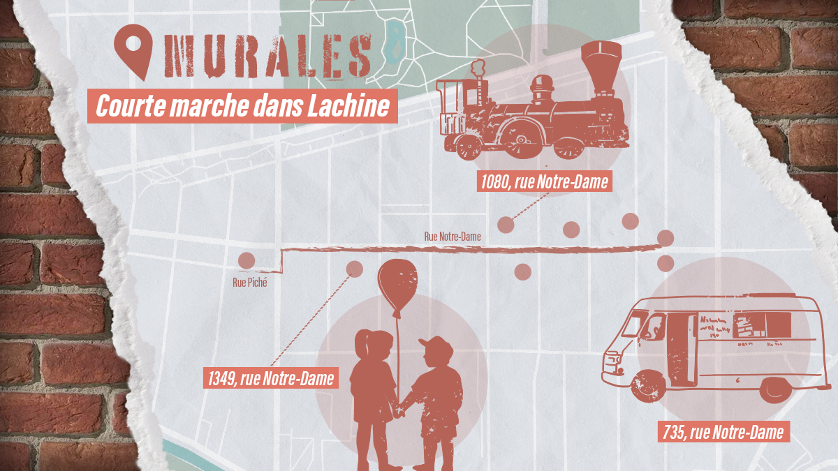 Dans l’arrondissement de Lachine, près de trois murales sur quatre sont issues de ce groupe d’artistes. Une petite marche d’une dizaine de minutes le long de la rue Notre-Dame, entre les 15e et 7e Avenues, suffit pour apprécier les œuvres qui représentent pour la plupart le Montréal d’antan.