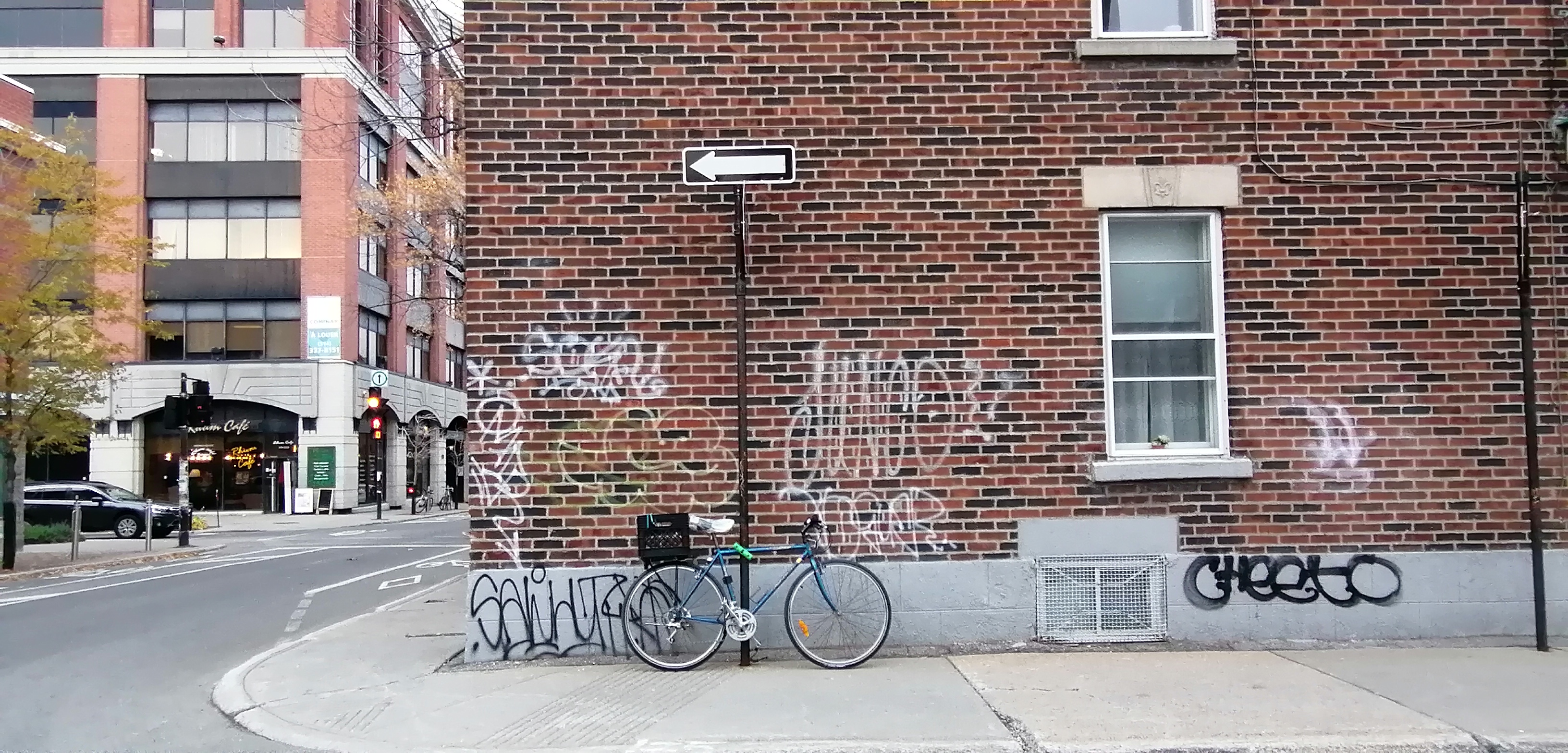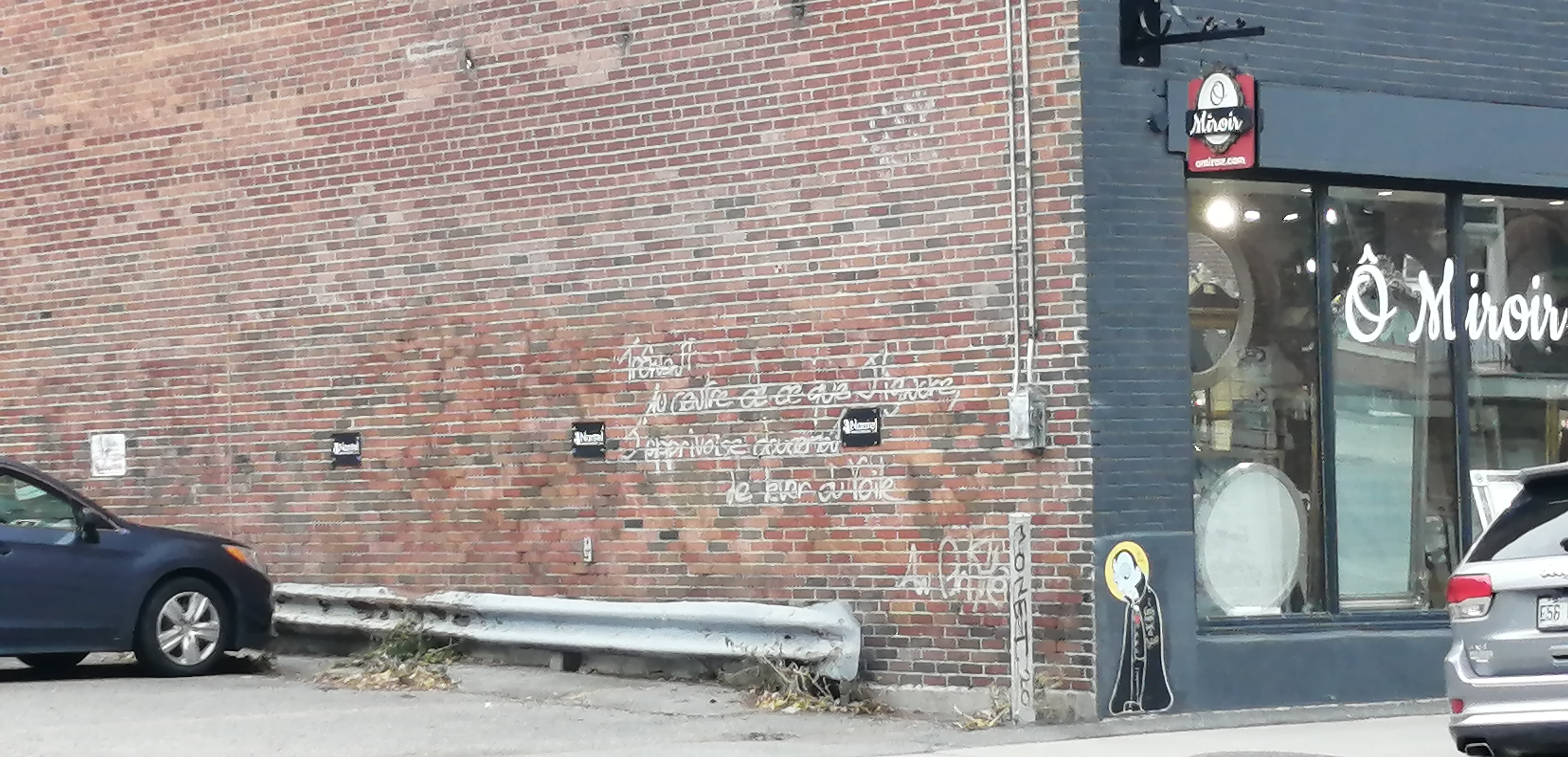 Aucune surface n’est épargnée : les logements, le sol, les panneaux de signalisation. Et même les institutions, comme l’École nationale de théâtre du Canada ou encore la bâtisse des Sœurs franciscaines missionnaires de Marie.