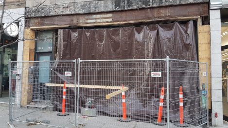 Le local est actuellement en rénovation. Une grande bâche brune recouvre la vitrine de l’édifice.