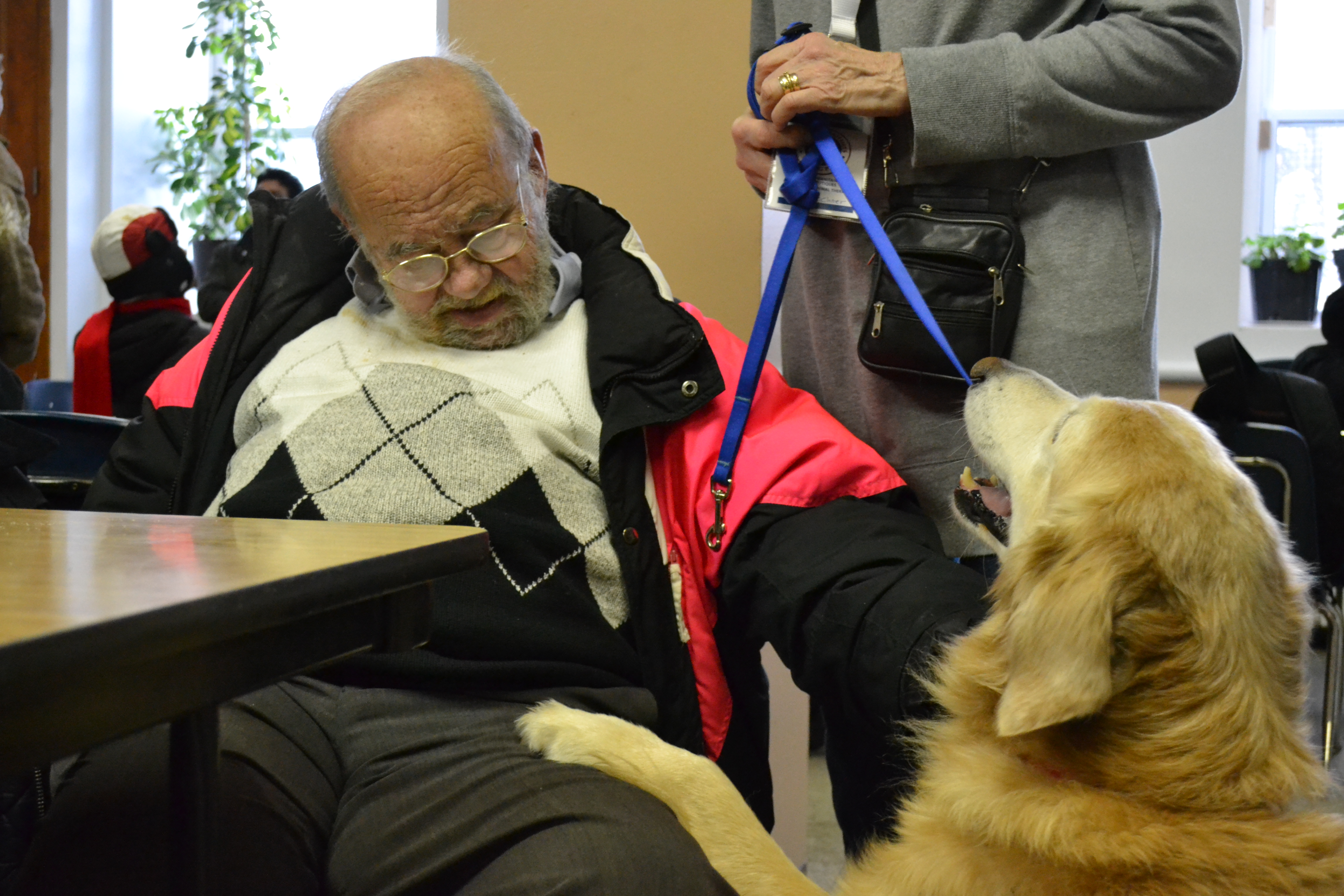 Sur place, ils sont accueillis avec joie par les clients, notamment les habitués de l’endroit. Dans la cafétéria de l’organisme, ils se déplacent de client en client. Ceux-ci les flattent, leur donnent des câlins et leur parlent, souvent plus qu’aux intervenants du centre.