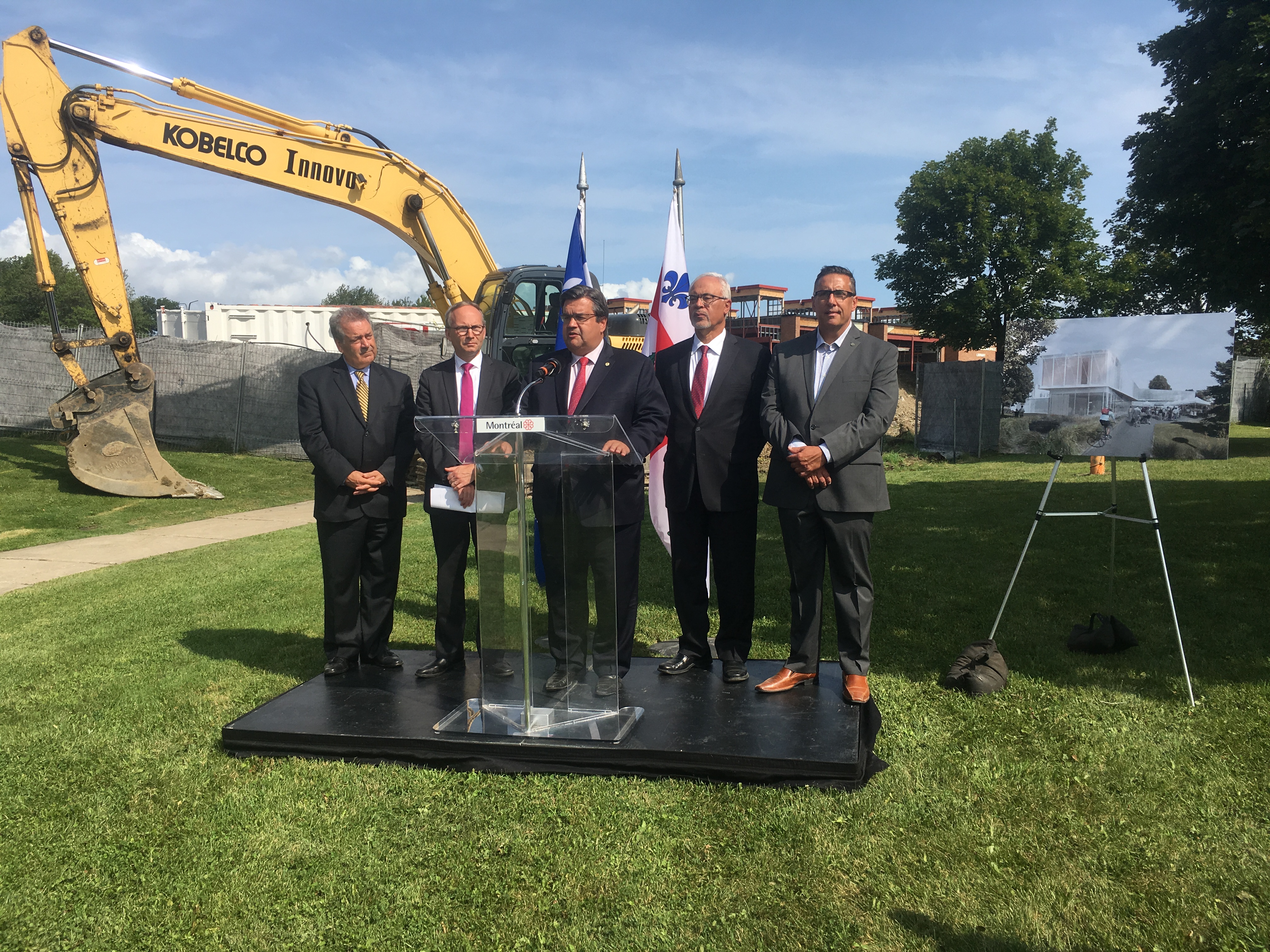 Le maire de Montréal, Denis Coderre, le ministre des Finances, Carlos Leitao, le député de Côte-des-Neiges–Notre-Dame-de-Grâce, Russel Copeman, et le maire de Pierrefonds-Roxboro, Jim Beis, ont visité le chantier. «On conserve 30% de l’ancienne bâtisse, mais avec le produit final, c’est carrément une nouvelle bibliothèque que l’on propose», a indiqué Denis Coderre.