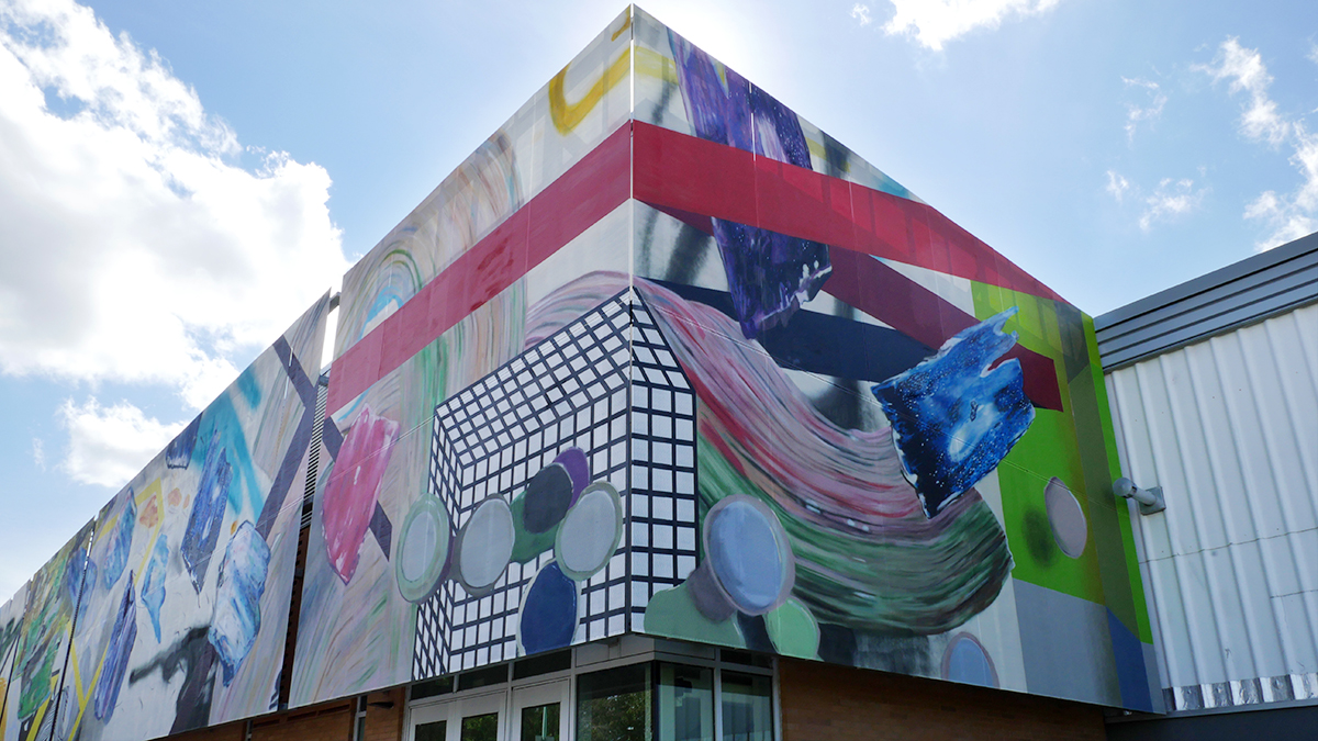 La murale a la particularité d’être peinte sur les plaques de métal qui ornent l’édifice. Légèrement transparentes à cause d’une multitude de petits trous, ces plaques donnent une nouvelle matérialité à l’œuvre. Un aspect qui réjouit Jean-Sébastien Denis: «Dépendamment du soleil, l’œuvre change continuellement. C’est une surprise que l’on n’avait pas du tout prévue.»