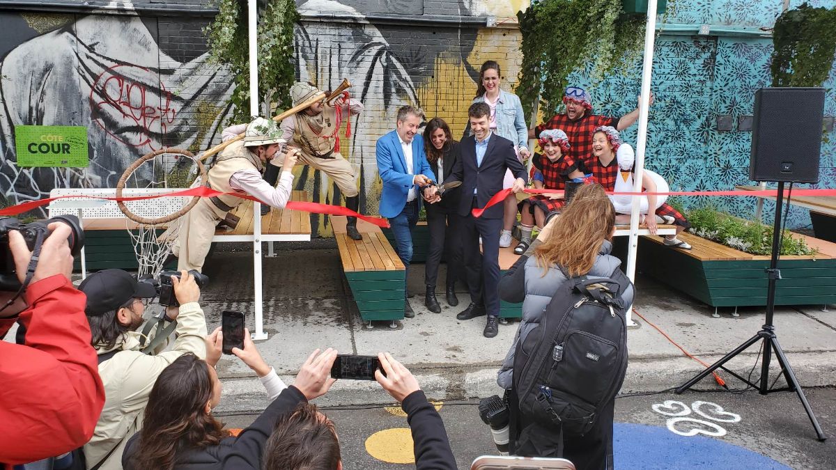 Dans les rues piétonnes parsemées de dessins autour du marché Jean-Talon, le maire de Rosemont-La-Petite-Patrie, François Limoges, dirige une marche santé d’usagers venus découvrir le nouveau lieu. Ces artères, fermées à la circulation automobile, du jeudi au dimanche de 11h à 17h, sont tapissées de fruits, de légumes et d’autres produits, sous forme de dessins.