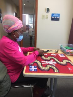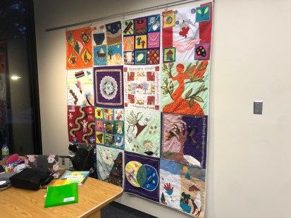 Cette création d’assemblage de textiles, qui prend la forme d’une courtepointe, avait pour but de raconter l’expérience respective des participantes.