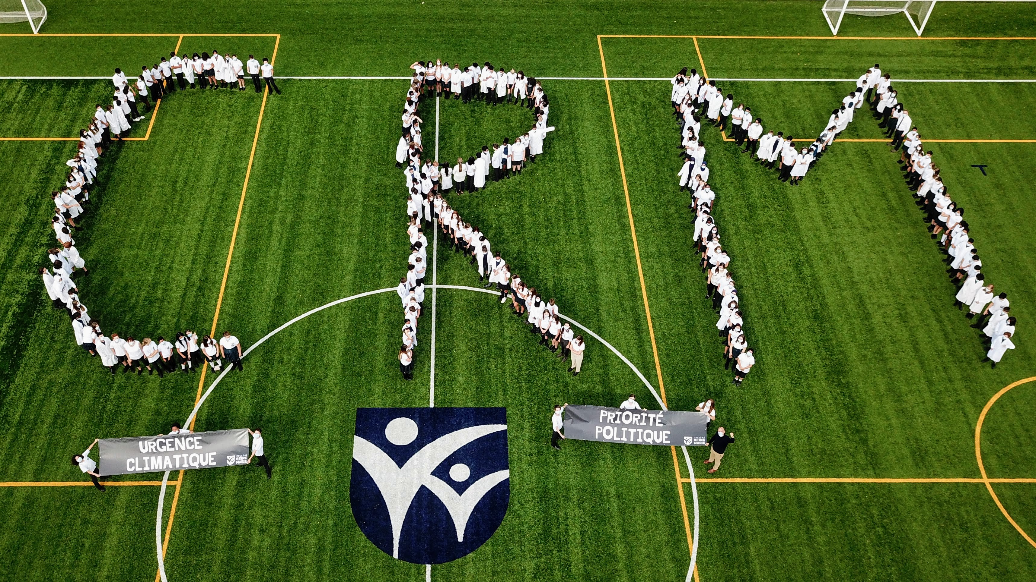 300 élèves ont écrit les lettres CRM, pour Collège Reine-Marie, vendredi sur le terrain de football du collège.