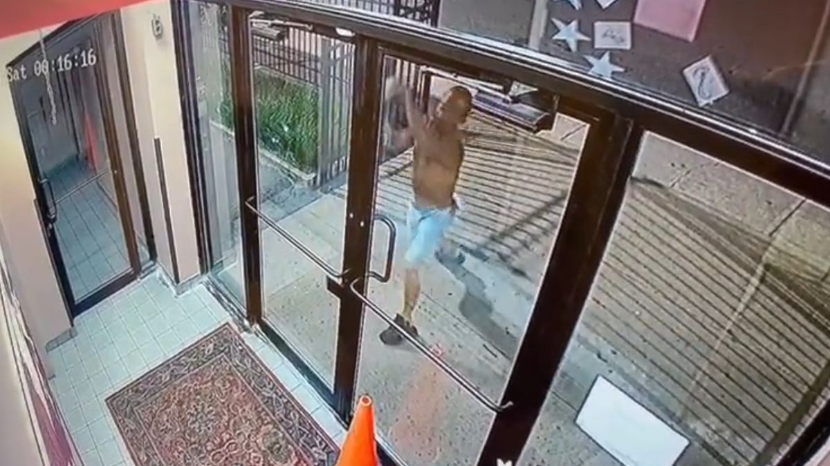 On peut apercevoir, sur la séquence, un individu torse nu en train de tenter de briser les vitres des portes d’entrée du lieu de culte, à l’aide d’une brique imposante.