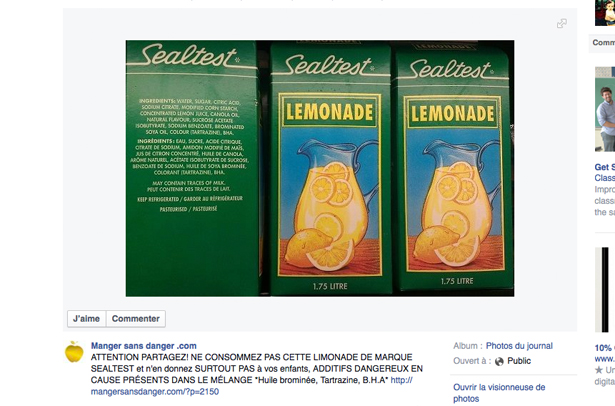 Verdict: Remarquez que le BVO est un des derniers ingrédients sur la liste de ceux qu’on retrouve dans la limonade Sealtest, ce qui veut dire qu’il n’en a probablement pas beaucoup. Panique-o-mètre: 2/10